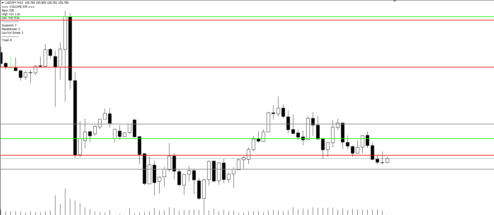 - High Volume Zones: Price levels where strong buying/selling occurred