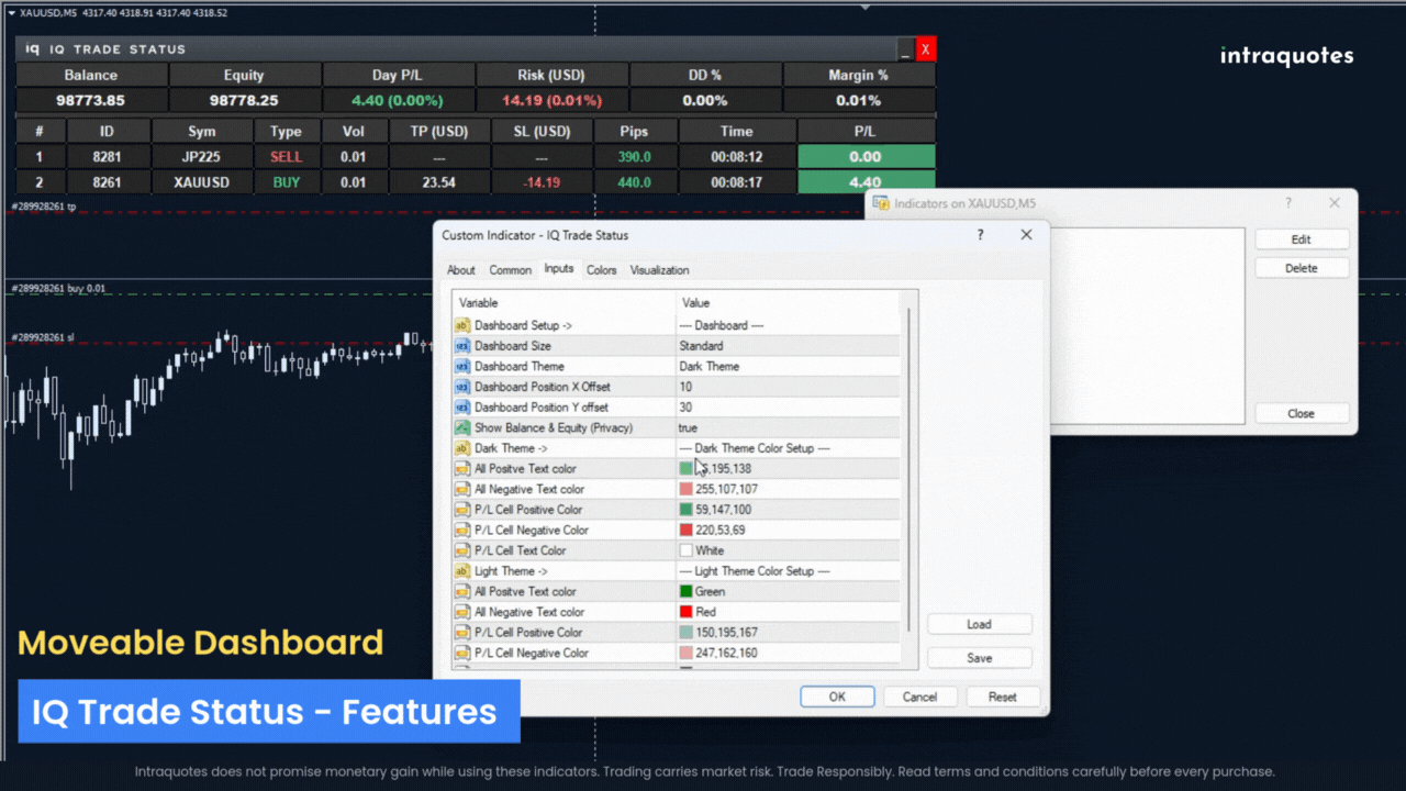 Indicator has option to hide or show balance and equity on the dashboard for privacy reasons. - Dark Theme Colors