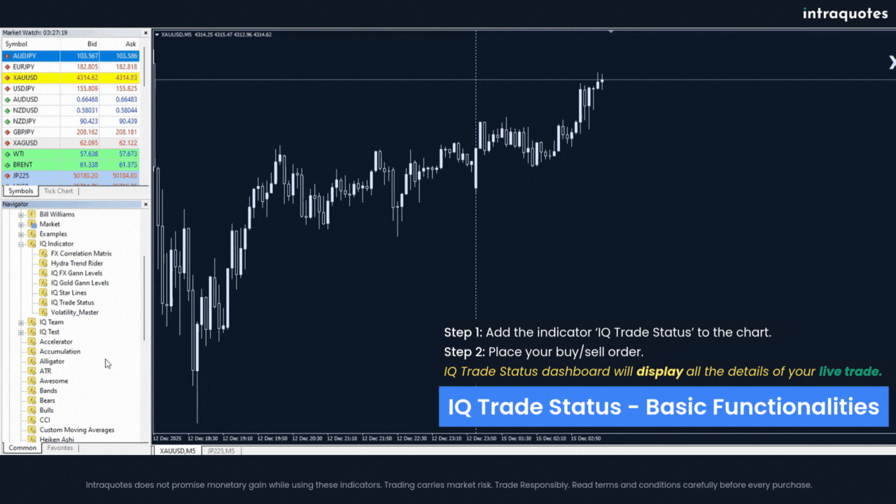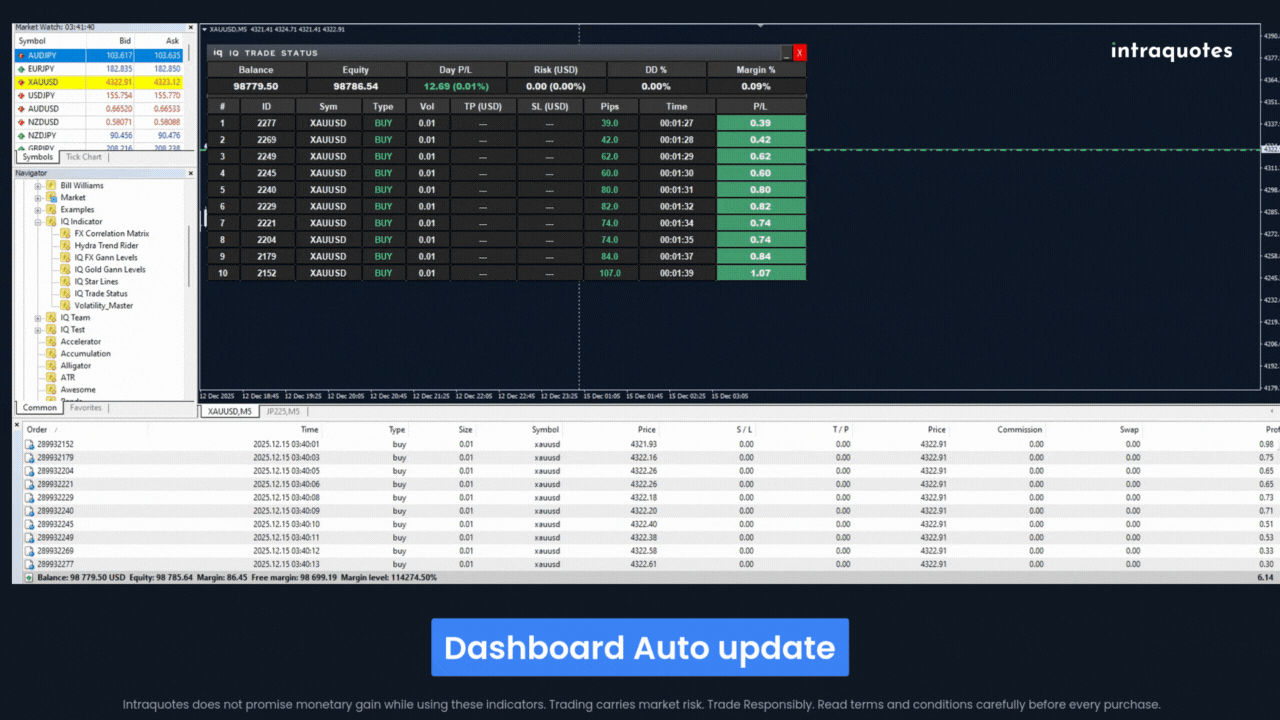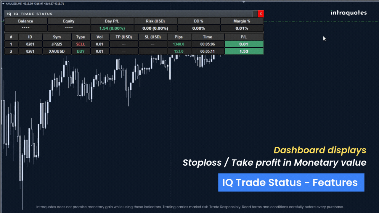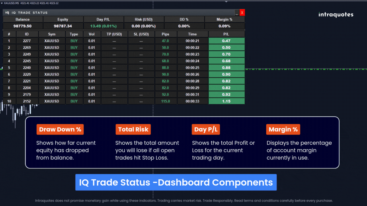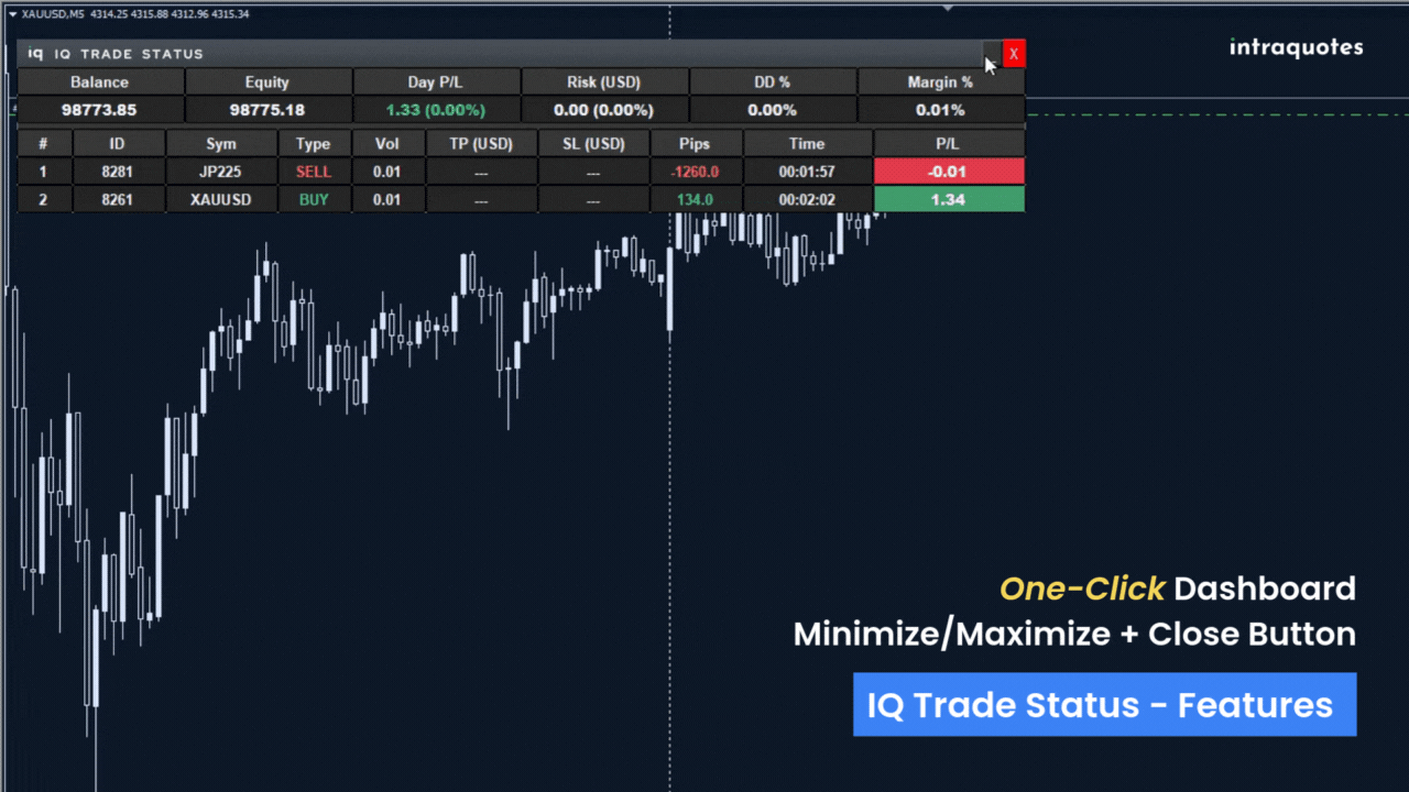 IQ Trade Status is not just a trade panel; it is a professional dashboard designed for MetaTrader. It replaces the default Terminal window with a clean, structured, and actionable overview of your account and open trades.