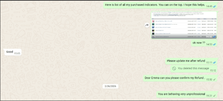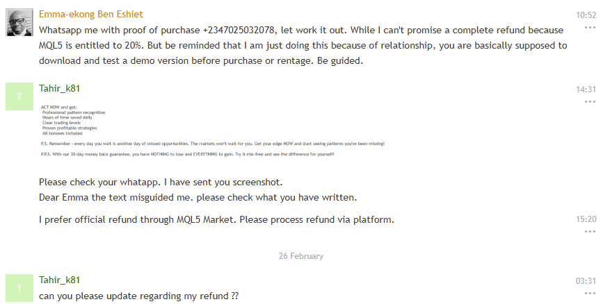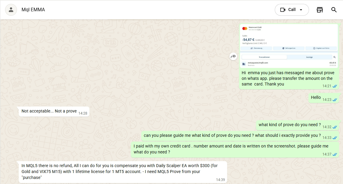 Instead of handling the issue professionally inside MQL5, I was redirected to private WhatsApp communication and offered a different private EA outside the Market.