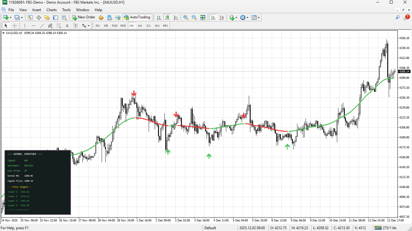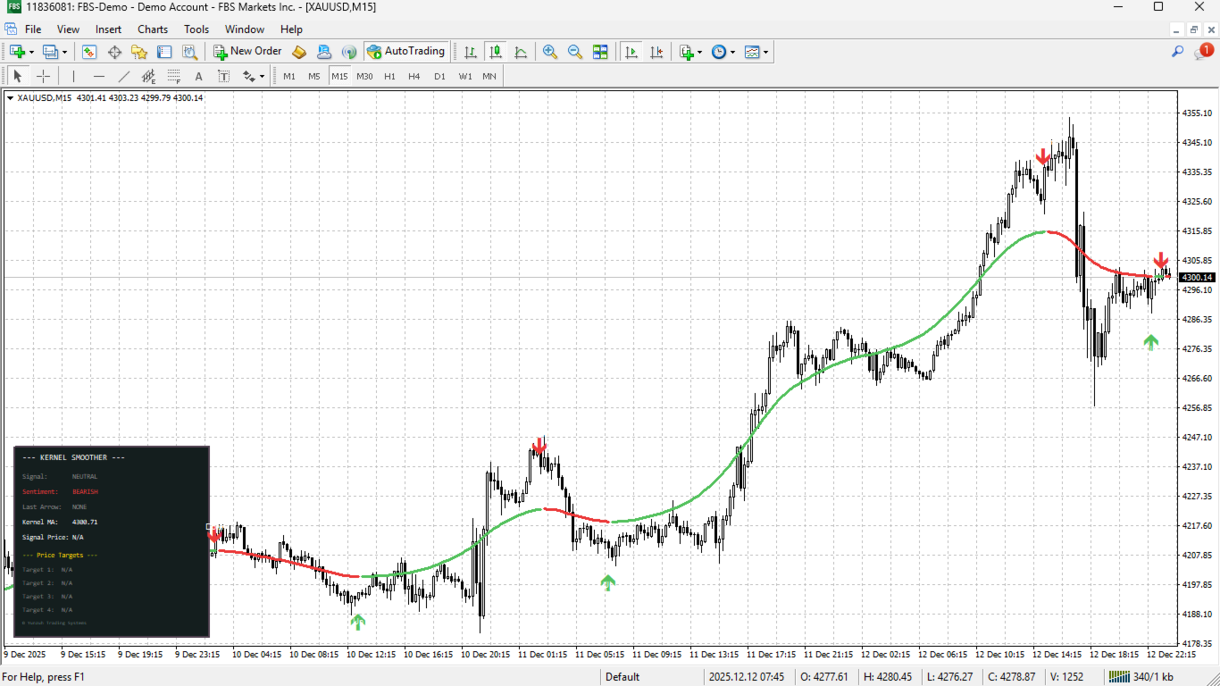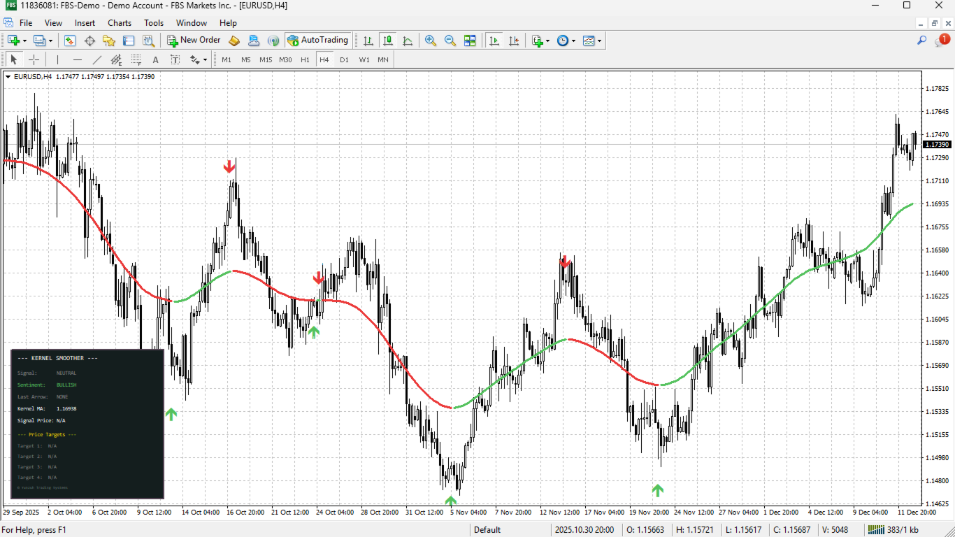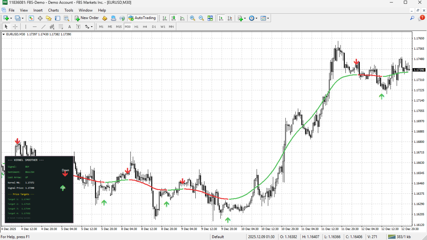 Every visual element is fully customizable. Adjust bandwidth parameters to control smoothing intensity, select from multiple price sources, configure arrow positioning using pips, ATR percentage, or points, and tailor all colors, sizes, and text elements to match your chart aesthetic and trading style.
