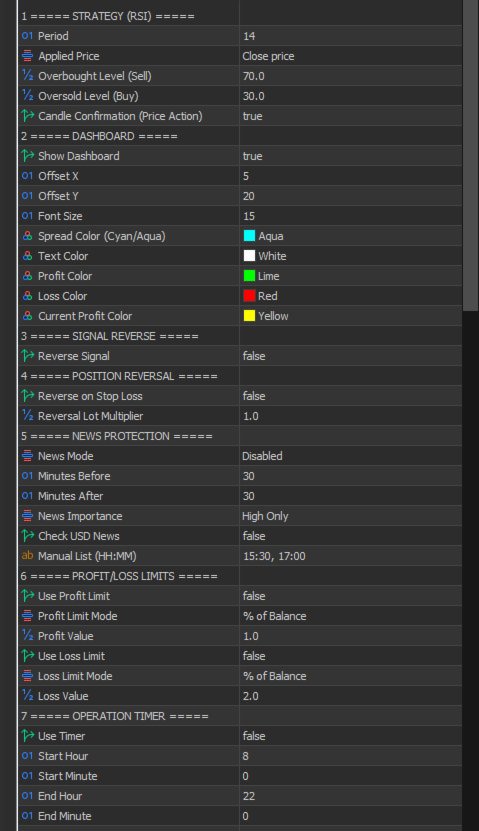 Candle Fixation (Price Action): After receiving the primary signal from RSI, the robot does not open a trade instantly. It fixes a "Signal Candle" and analyzes its parameters, waiting for the bar to close to confirm market intentions.