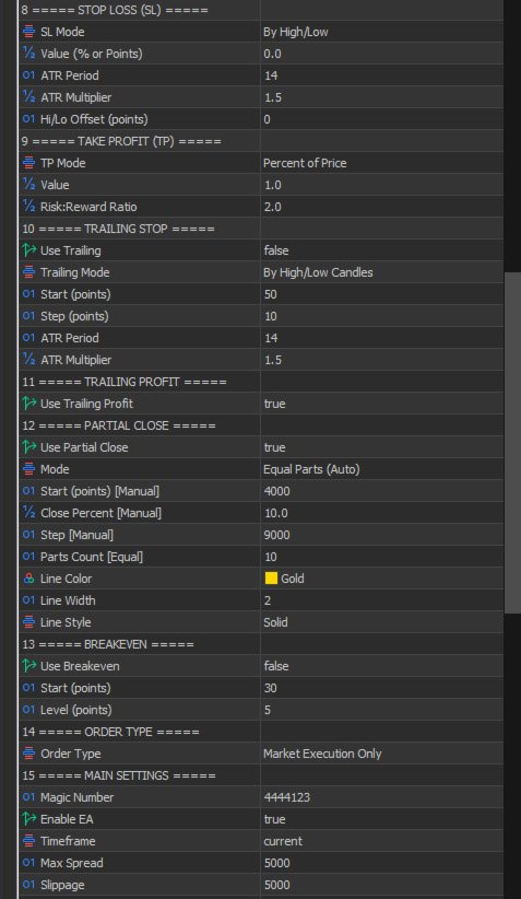 MANUAL (Classic): The advisor closes part of the position when the price passes a fixed distance (PartialStart) in points. If a step is set (Partial_Close_Step > 0), it will continue closing parts every N points.