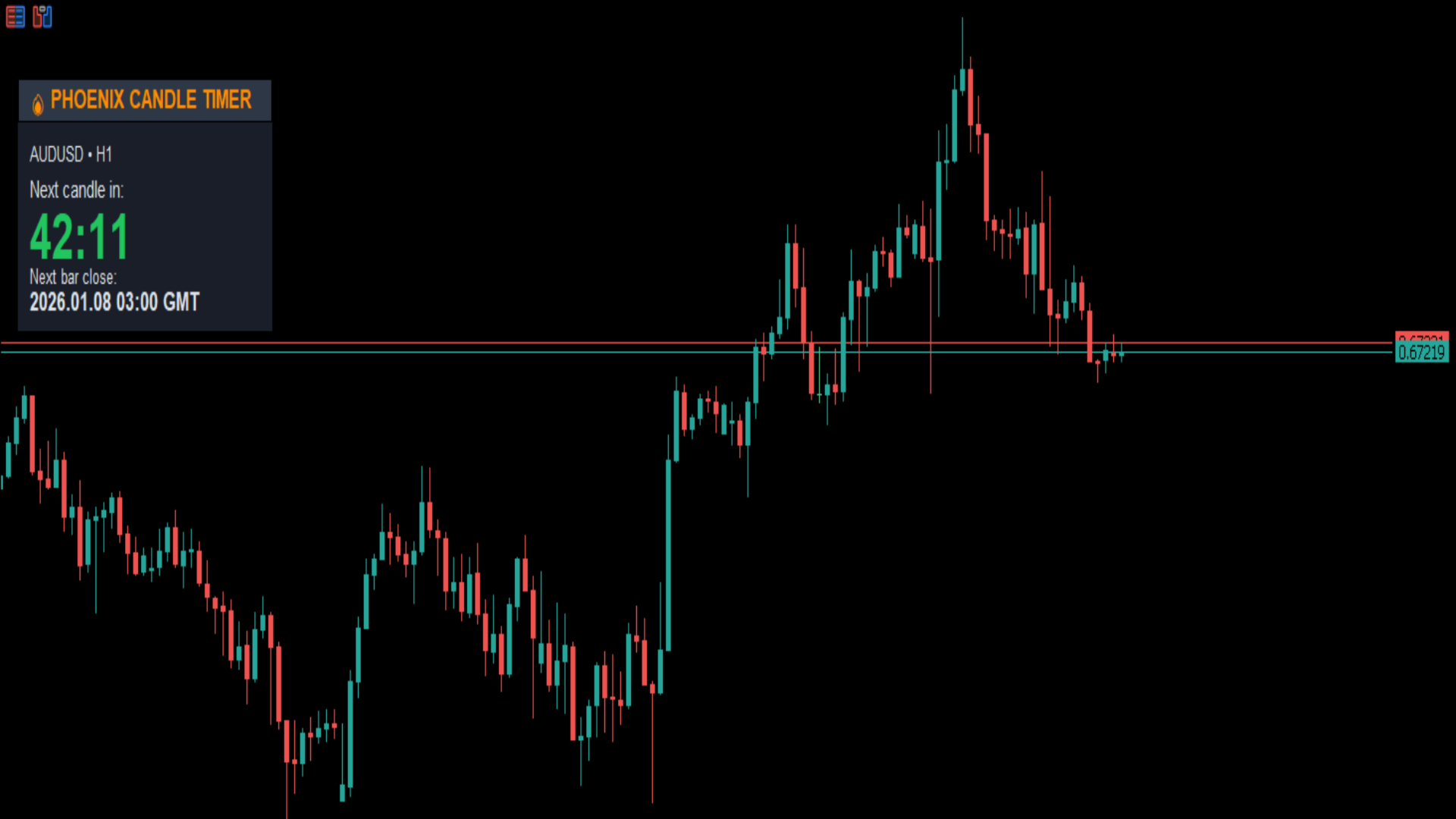 The Phoenix Candle Timer Panel provides clear countdown visibility synced to broker server time. The timer automatically adapts to chart timeframe changes and updates in real time, eliminating guesswork and improving execution precision across all timeframes.