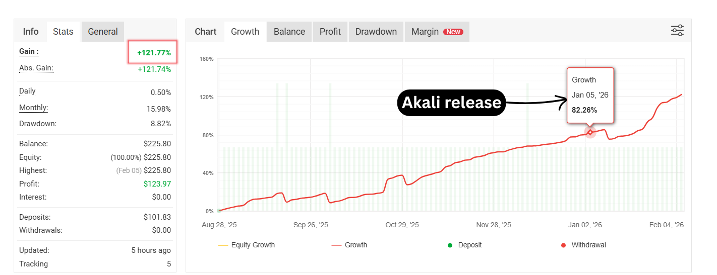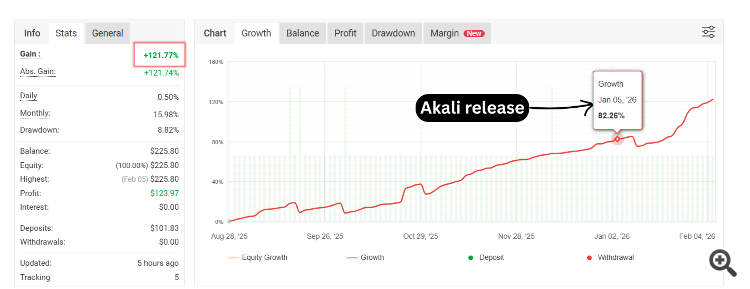 We launched Akali on January 5th when the signal was at 82% growth. Today, on February 5th, we are sitting at 122% total return.