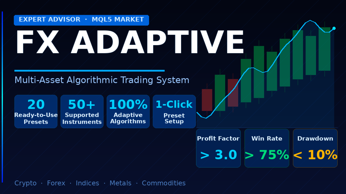 | FX Adaptive — multi-asset medium-term trading system with an adaptive chart-based self-learning algorithm. 20 ready-made presets for Crypto and Forex. Portfolio PF 3.41, WinRate 83%, Max DD 4.81%. LAUNCH OFFER Launch price: $199 — only until 21.03.2026, 19:00 UTC. After the offer ends, the price rises to $399. With each new batch of sales — the price continues to grow. Don't miss your chance to get in at the lowest price. |