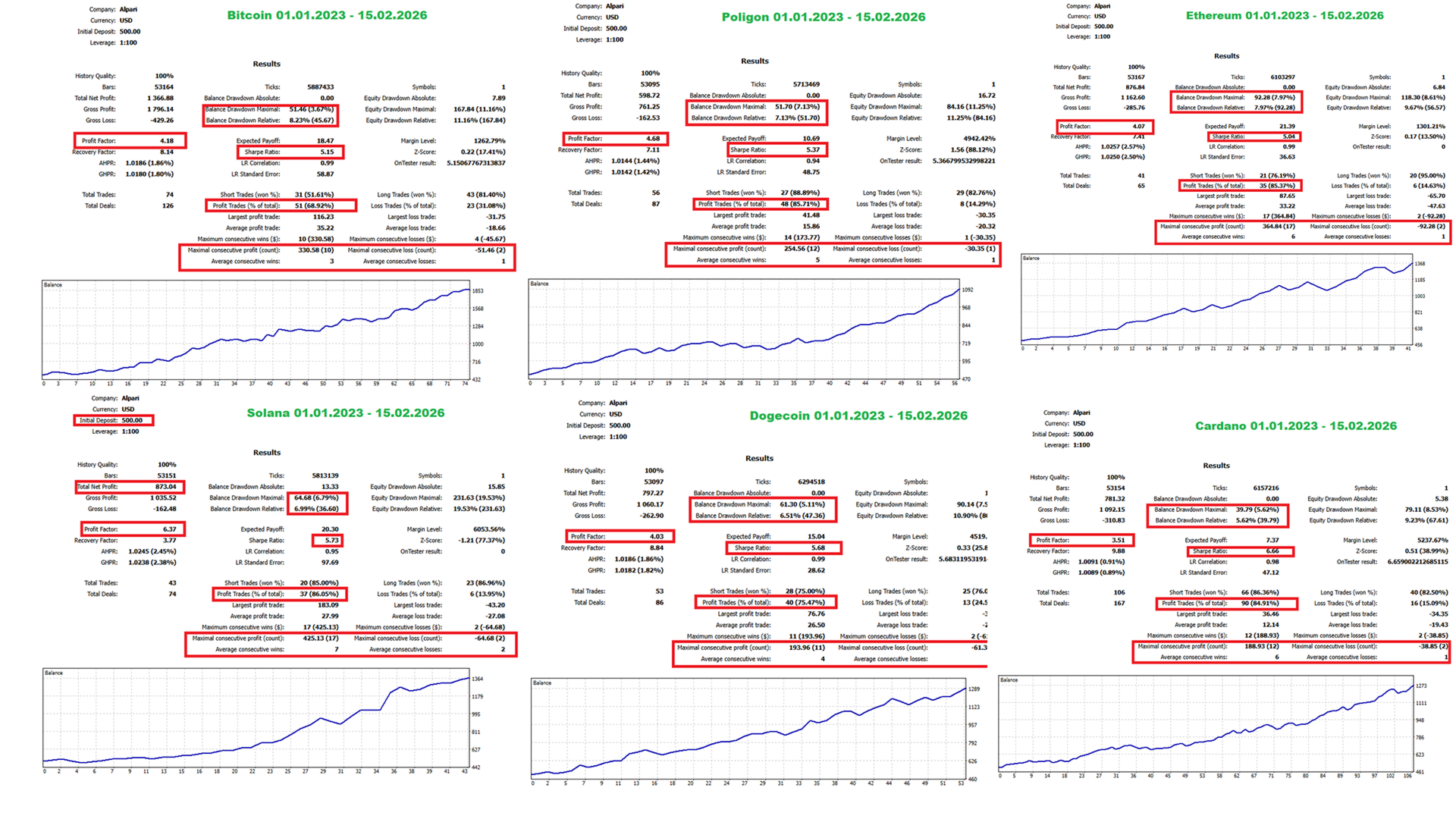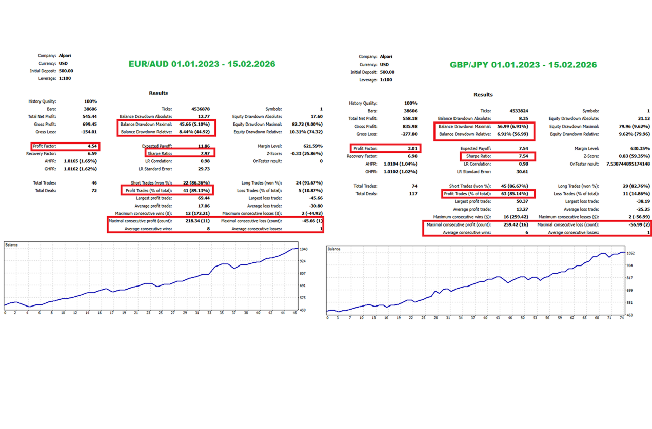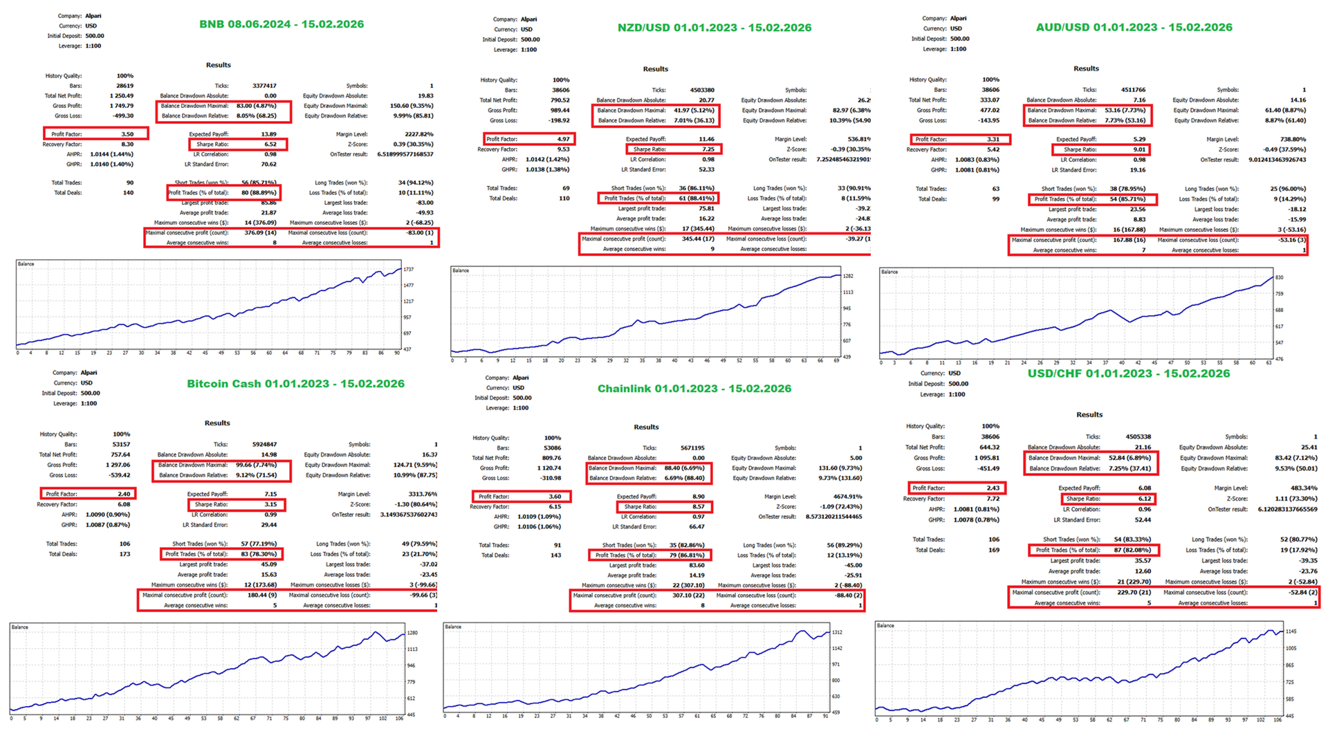 Portfolio results (QuantAnalyzer, Alpari ECN, 2023–2026 | Initial deposit $500 for all 20 instruments using built-in EA presets)