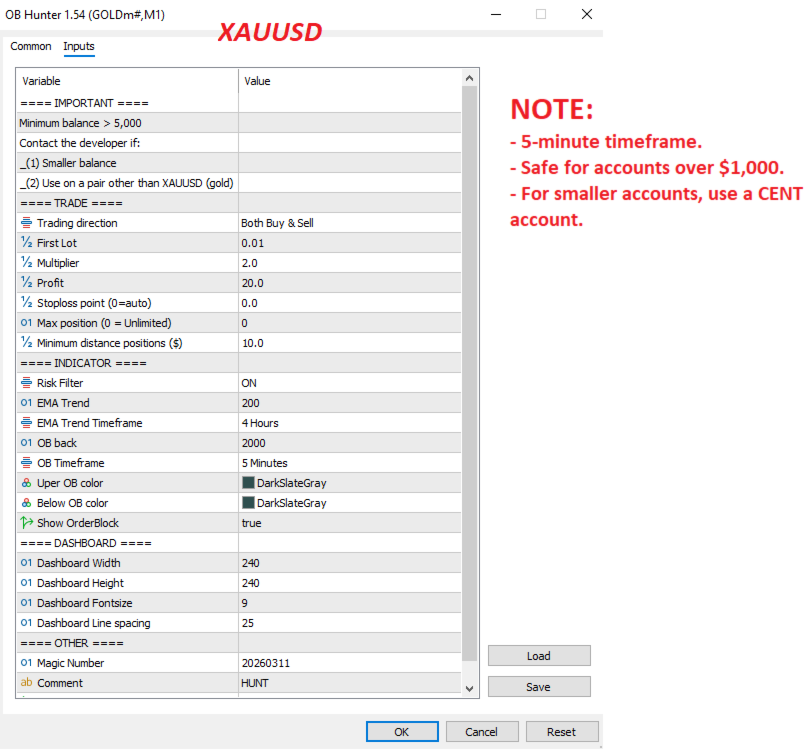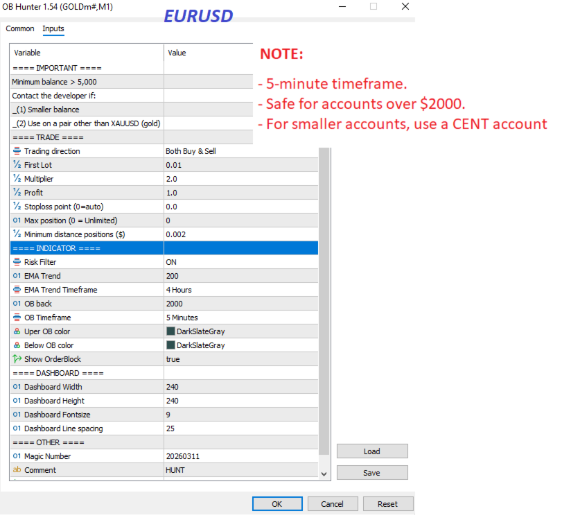 OB Hunter is an automated trading system based on the Order Block concept. The EA scans historical price data to identify important supply and demand zones, then places limit orders when price returns to these areas.