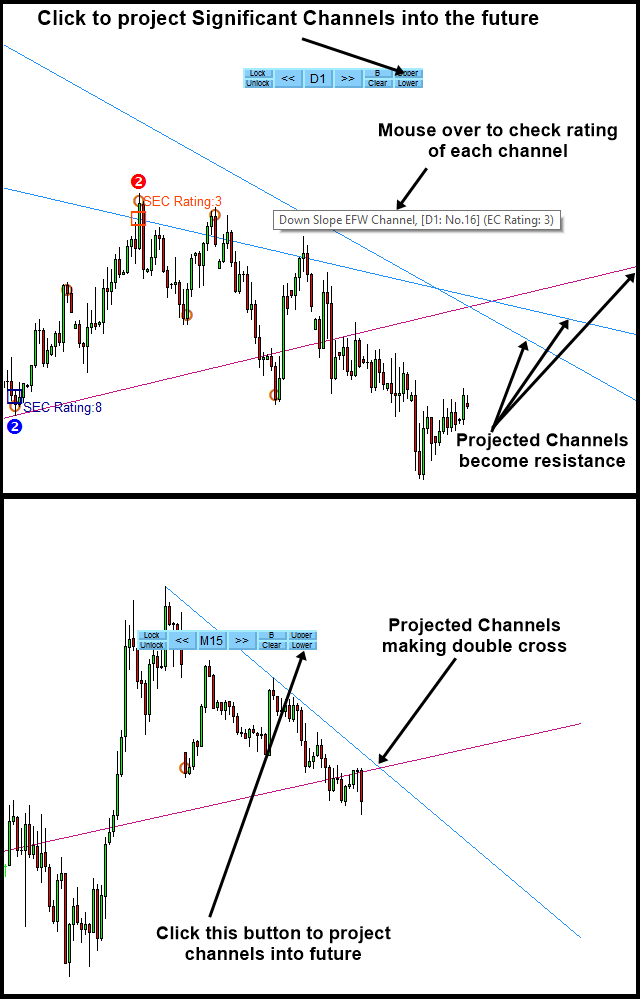 We have just released EFW Analytics version 10.6. In version 10.6, now you can project significant channels into the future. You can do this by either click on Upper button or Lower button. When you click Upper button, you will be projecting significant channel into upper price range. When you click Lower button, you will be project significant channel into lower price range. Before setting up your trading, please check the rating and lock the relevant channels for your trading. To lock each line, simply click over line. If you do not want to see them again, just click on Clear button.