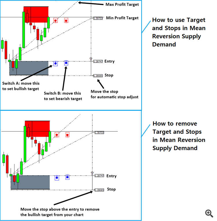 One of the greatest advantage of Ace Supply Demand Zone indicator is that it provide a flexible Profit and stop target for your trading. After you have learnt how to use this profit targets, now you want to learn how to remove them. Of course, there is a way to remove them. The trick is simply moving the stop text above the Entry text (for the case of buy). You will do the opposite for the case of sell. In the screenshot, the bottom image describe how to remove the targets from your chart.