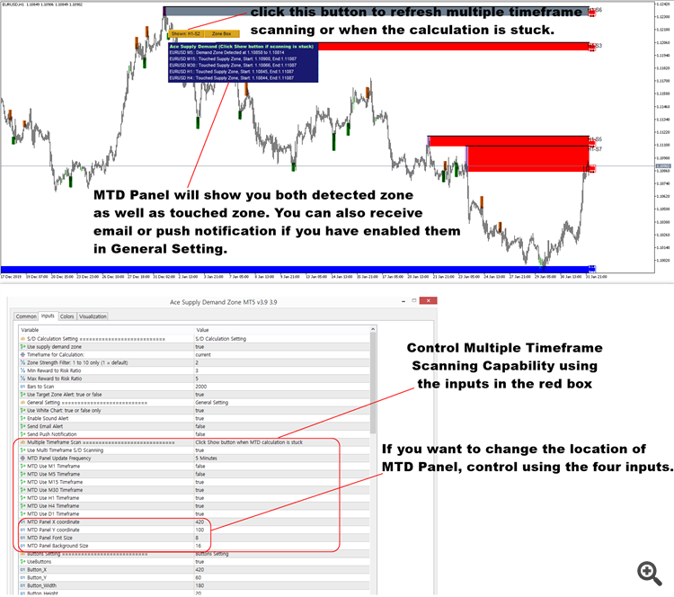 If you enabled email or push notification in the inputs under General Setting, then you can also receive the alert for the detected supply and demand zone as well as the touched supply and demand zone. The thing you need to understand about multiple timeframe scanning is that it requires multiple computation too per each timeframe. The computation can be heavier up to 7 times or more when you enabled M1 to D1 timeframes. Hence, due to data loading issues, the calculation might be stuck sometimes. In that case, just click Show button to refresh all the calculation. Of course, it is possible to switch off the multiple timeframe scanning if you only want to trade one timeframe.