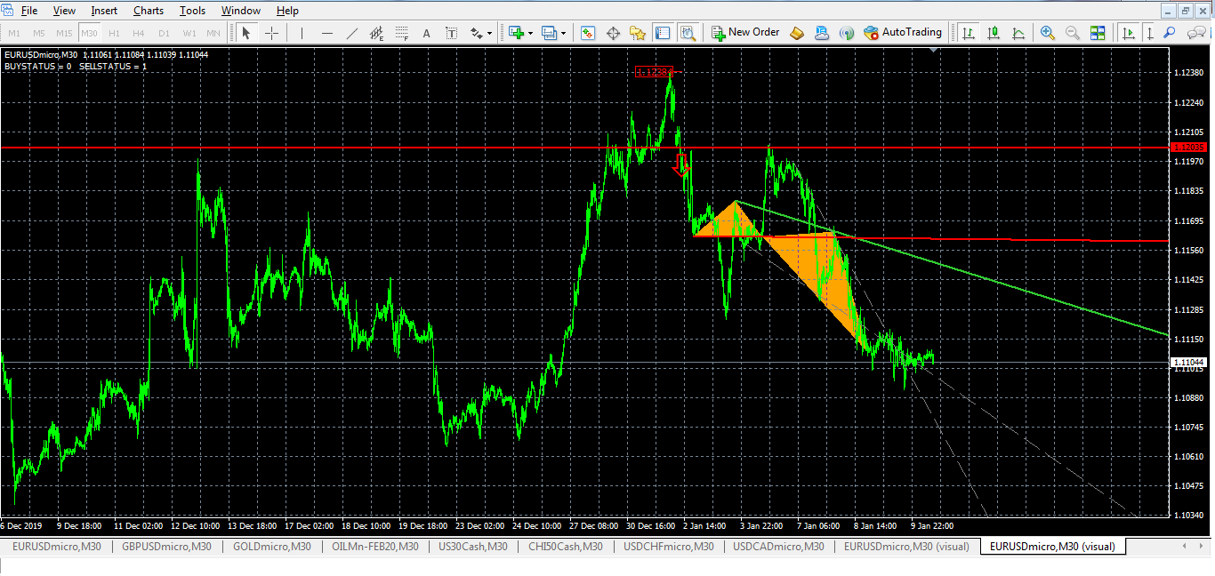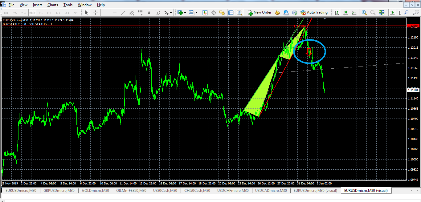 hello ,according to tester om eurusd m30 inputs( bars 200 , ma 100) a signal SELL on 31 dec 2019 after crossing rising wedge and butterfly levels (pic1) >>>