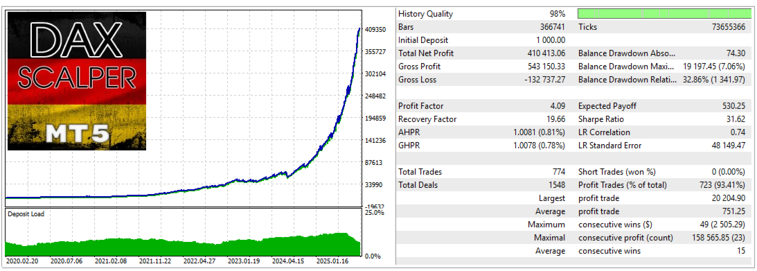 The Expert Advisor is fully optimized and ready to work. Add the Dax Scalper to the DAX M5 index chart.