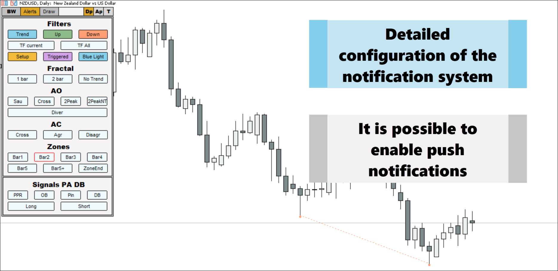 2. Finds all known AO and AC signals, as well as zone signals. Equipped with a trend filter based on the Alligator.
