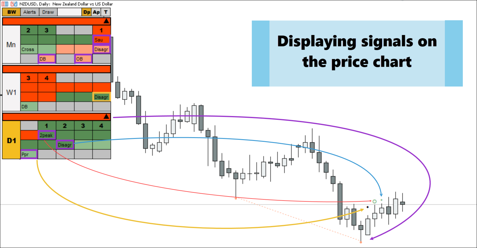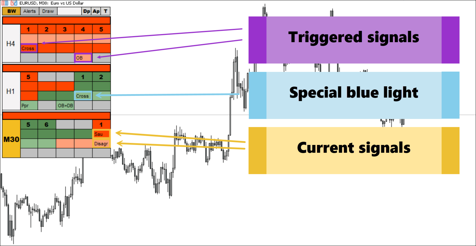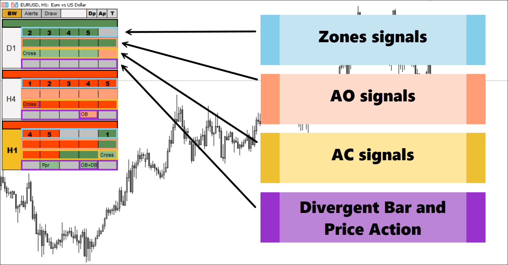 В индикаторе очень здорово собраны актуальные сигналы системы. Все очень понятно по одному взгляду. Честно говоря, когда изучала систему, то думала, как же все их одновременно запомнить и смотреть: и АО и АС и на каждом несколько, да ещё посмотреть разные таймфреймы. А тут все собрано в одном индикаторе, достаточно одного быстрого взгляда. И сразу несколько таймфреймов. Что особенно здорово, что выделены актуальные сигналы, уже не актуальные. Дивергенция есть. Очень удобно и понятно. Обязательно советую прочитать сначала инструкцию, чтобы узнать все функции индикатора. Спасибо автору!