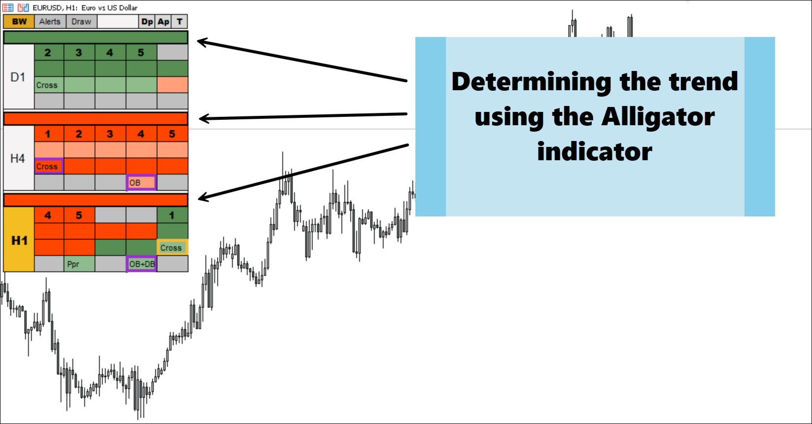 Bill Williams Advanced is designed for automatic chart analysis using Bill Williams' "Profitunity" system. The indicator analyzes four timeframes at once.