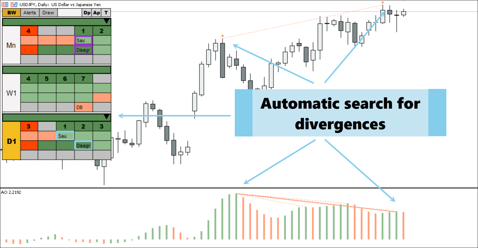 4. Finds divergences. The detected signals are displayed on the indicator panel, on the chart, and on the AO.