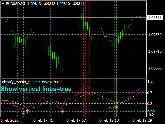 The Identify Market State indicator allows you to set the beginning of a new trends and pullbacks on an existing trend. This indicator can be used both for trading on scalper strategies and for long-term trading strategies.