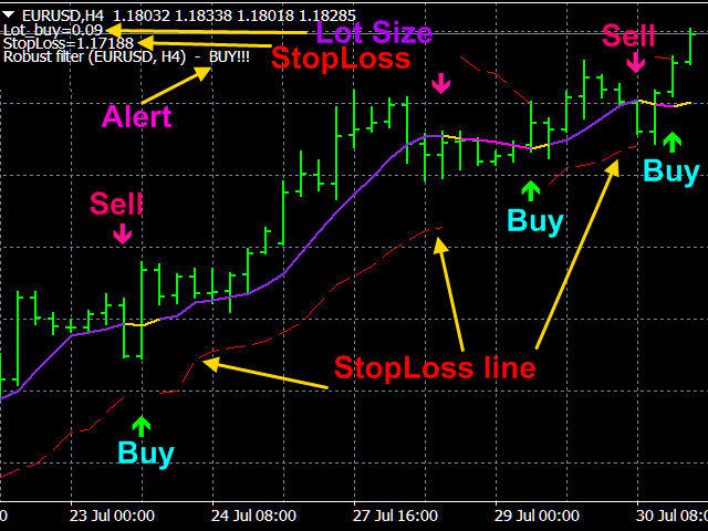 The Robust filter indicator is based on the robust filtering algorithm developed by the author using the multi-period averaged moving median.
