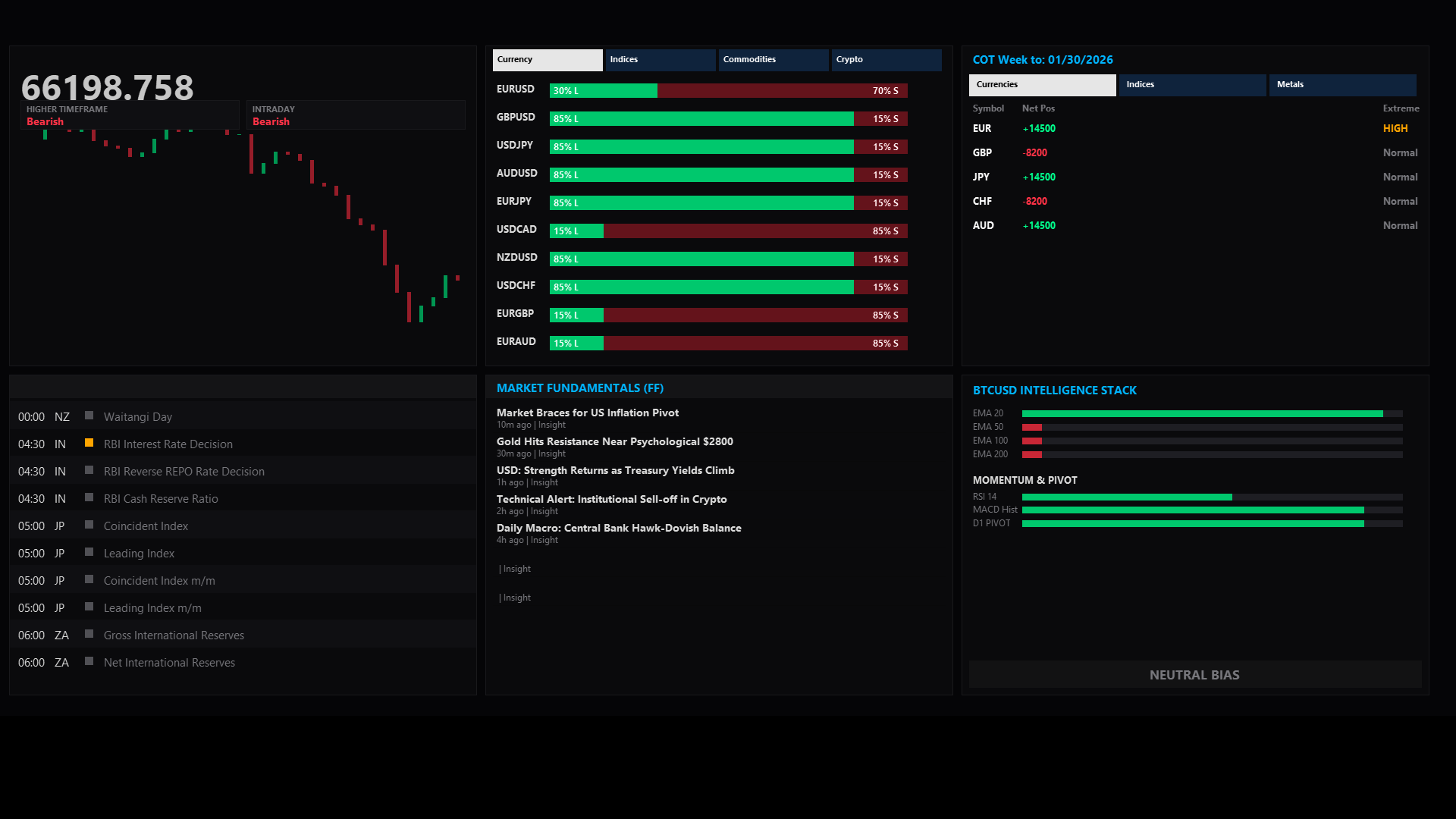 Filtered Economic Calendar: Displays upcoming high and medium impact news specifically for the 8 major currencies (EUR, USD, JPY, GBP, AUD, CAD, CHF, NZD).