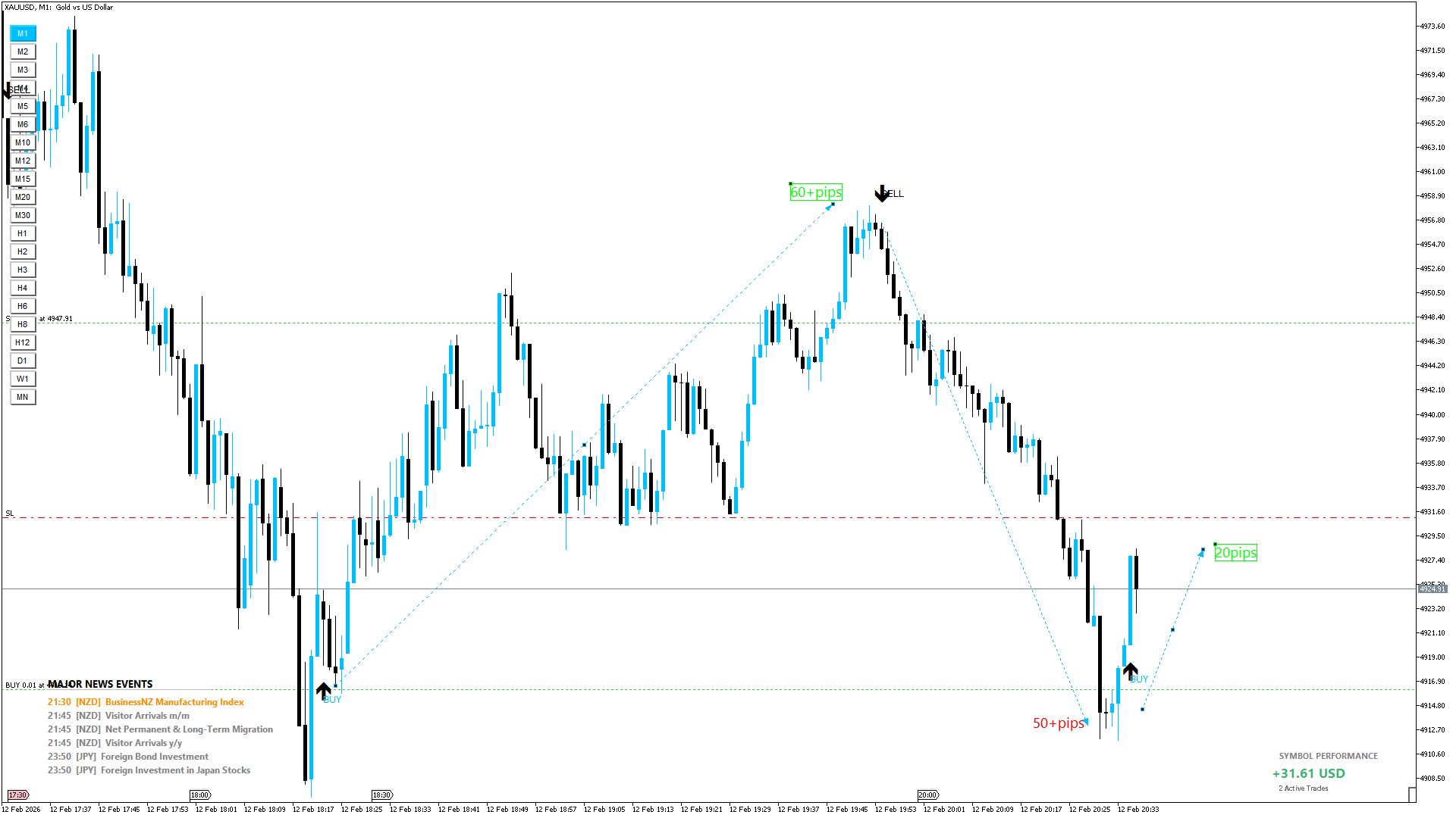 Live Performance Tracker: A dedicated "Symbol Performance" box in the bottom right calculates the real-time net Profit/Loss, Swap, and Commission for the specific symbol being traded.