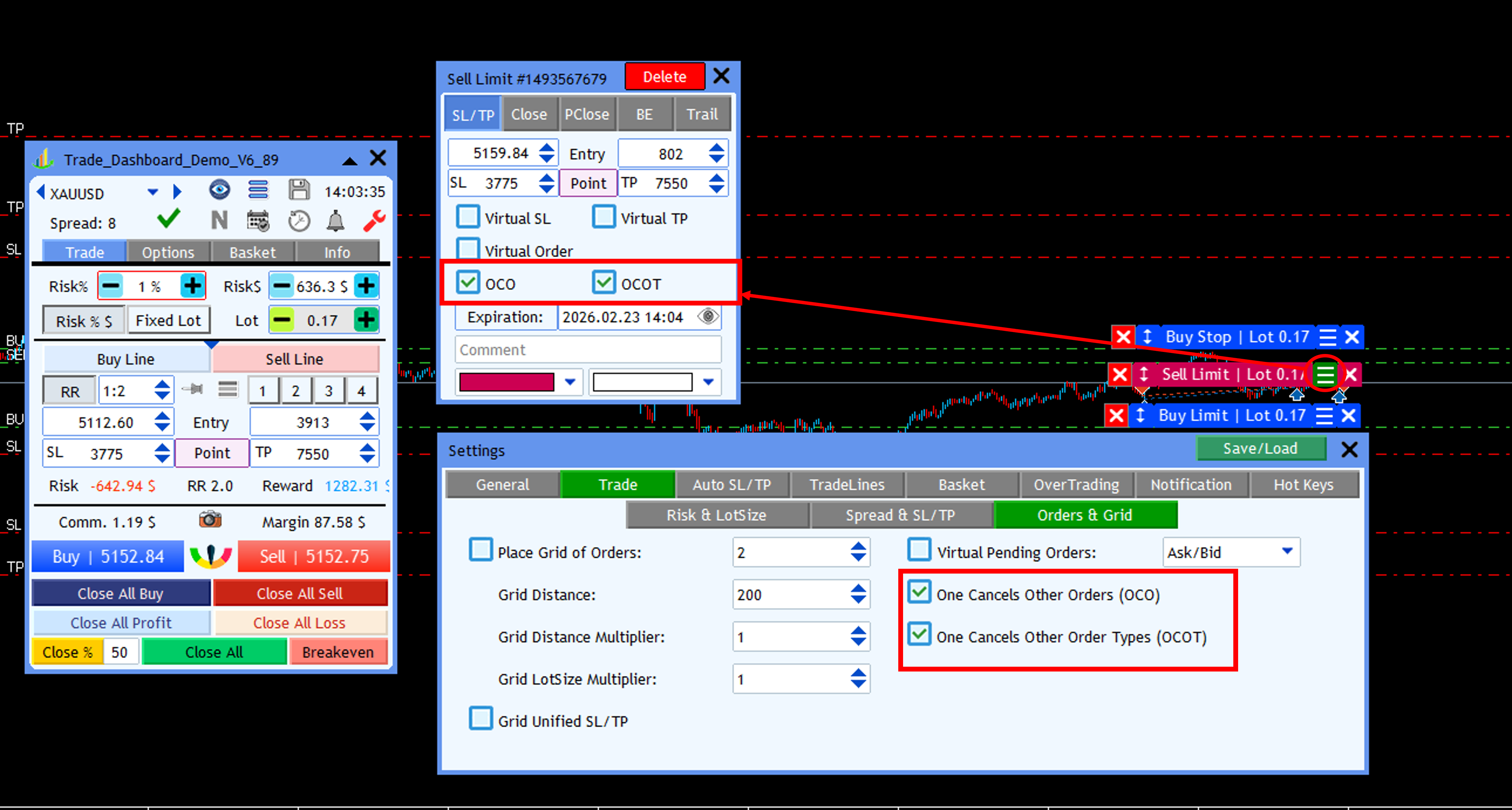 Trade Dashboard supports OCO and OCOT functions for pending orders — powerful tools for automated order control.