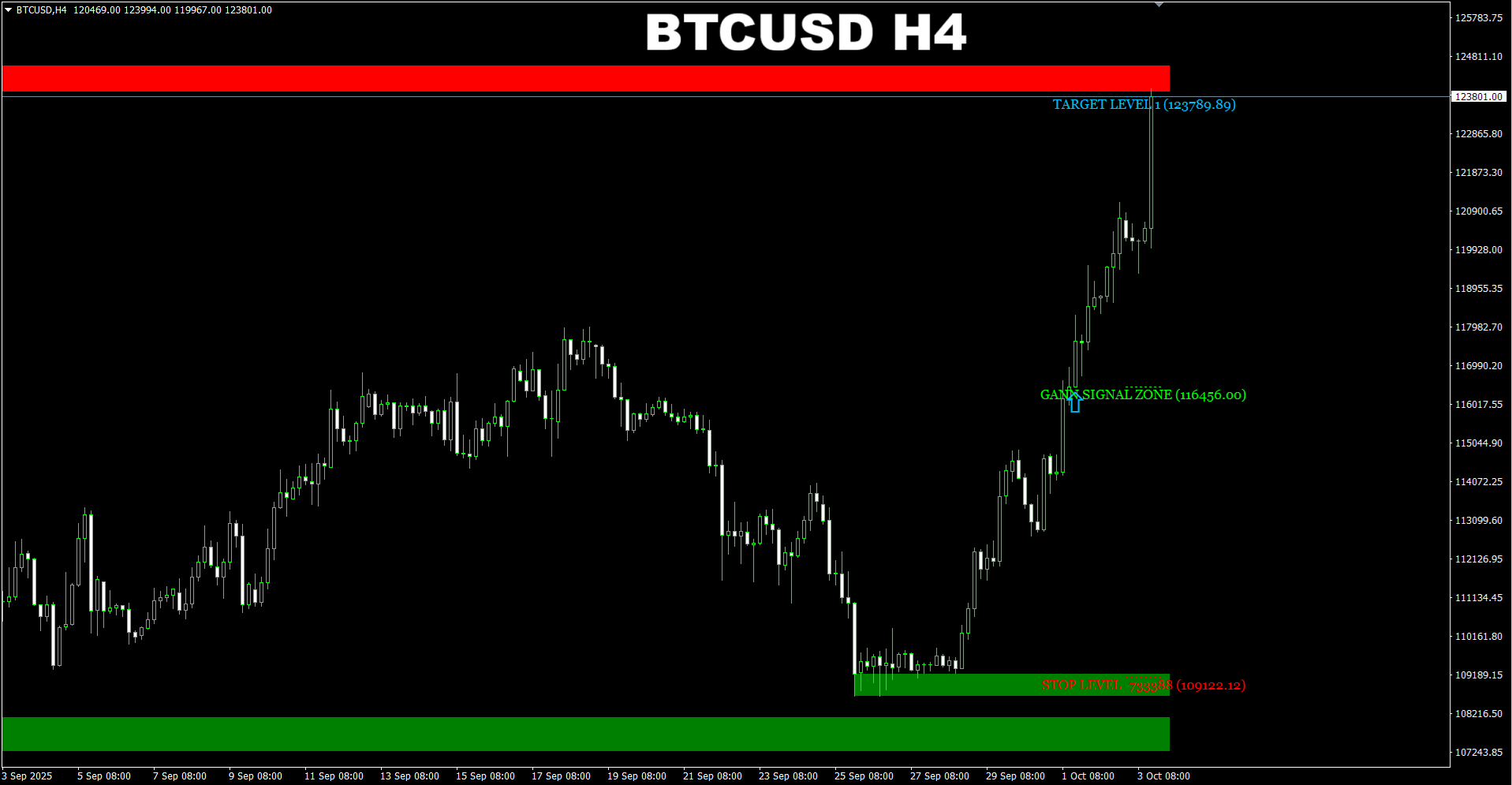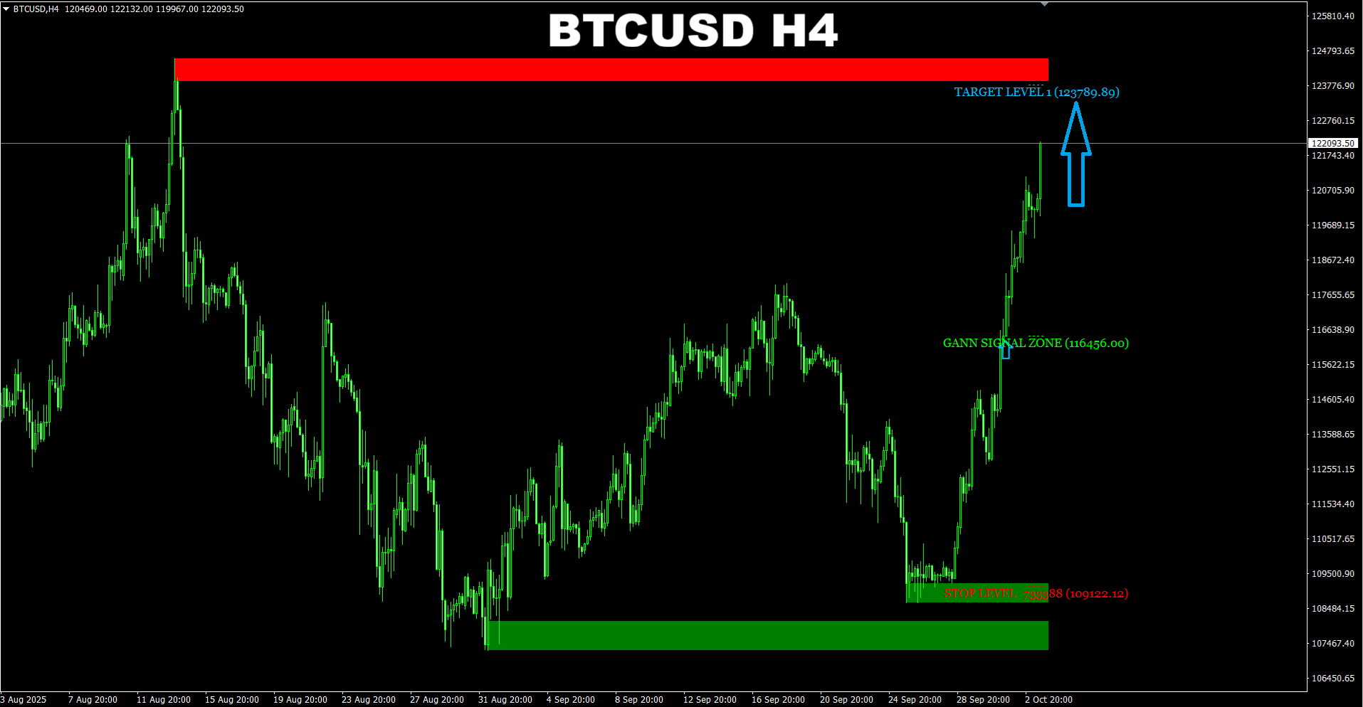 Gann Made Easy. BTCUSD H4. Price is now heading to the area of 123K-124K. Then we will probably see a pullback where the pair will accumulate enough volume for a new high which it is going to take. The probability is high that we will soon see the price approaching the area of 128K-129K.