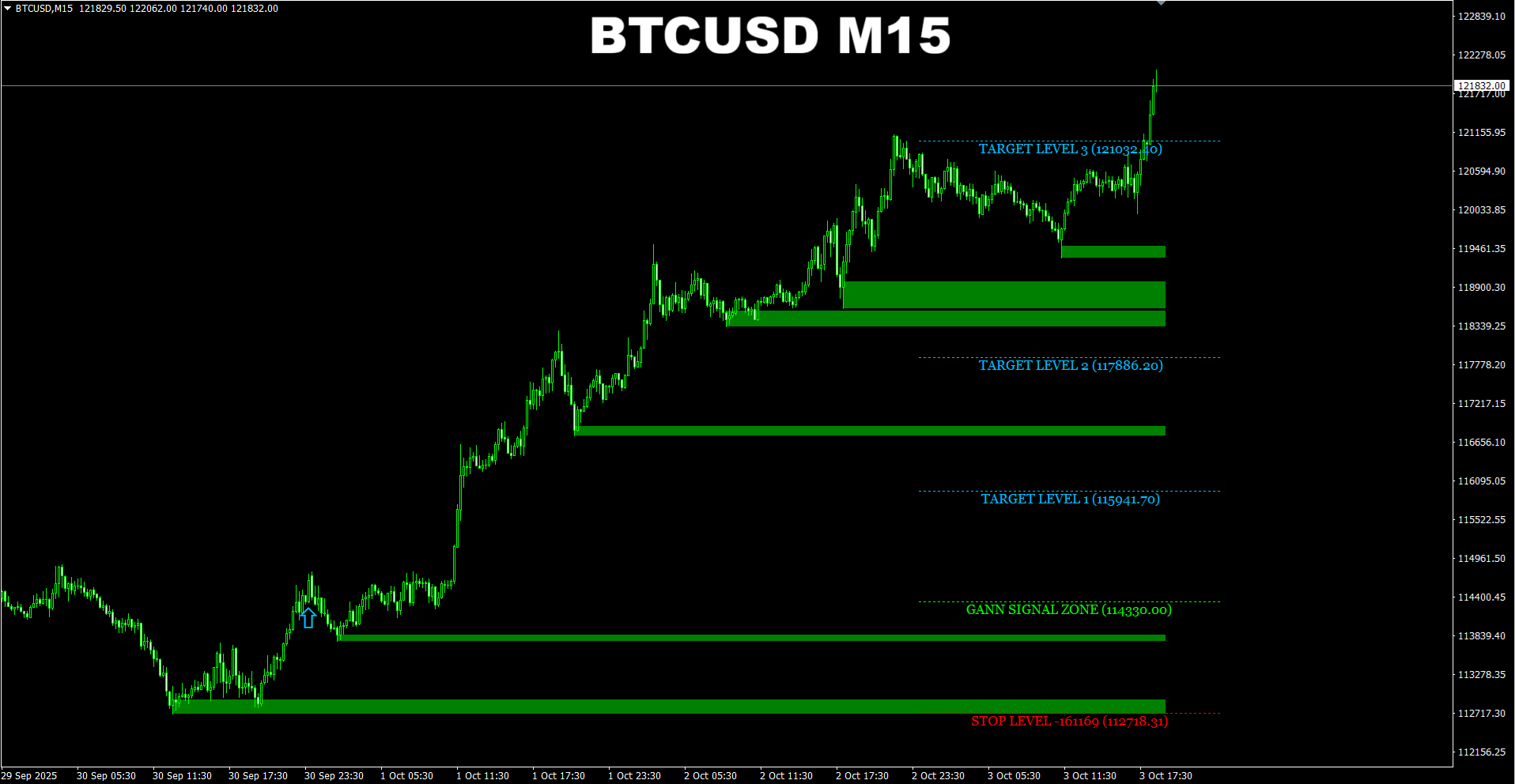 Gann Made Easy. BTCUSD M15. Update on current BUY signal. Price reached the TP3 and is going higher. I will provide you with the next target we can follow in the next message.