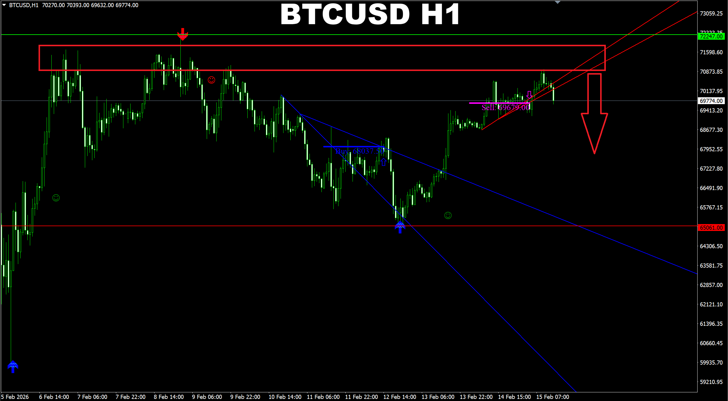 SR Master + Price Action System. BTCUSD H1. Update on current market. Price has been pushed down by the Resistance area and it has now returned to the SELLING AREA which means the SELL wave is being developed now.