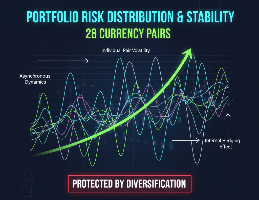 In this part, we transition from theory to the defensive architecture of the system. The focus here is on how the simultaneous trading of 28 assets creates a self-balancing portfolio and why an optimal stop-loss is the ultimate foundation for long-term capital preservation.