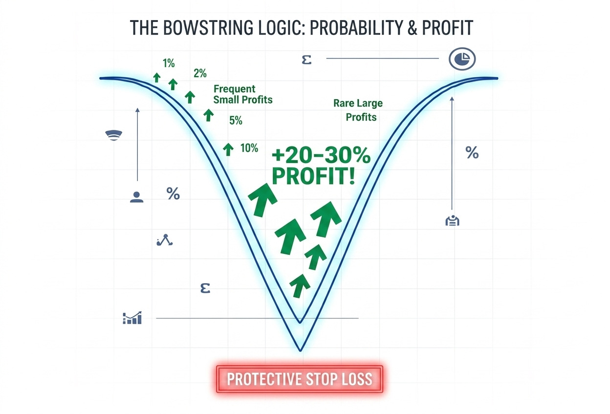🏹 THE BOWSTRING LOGIC: While small pullbacks result in steady trades, a deep correction that returns to the primary trend creates the "bowstring shot" effect. This powerful event occurs when a fully loaded grid closes its total volume, generating a rapid surge in capital growth.