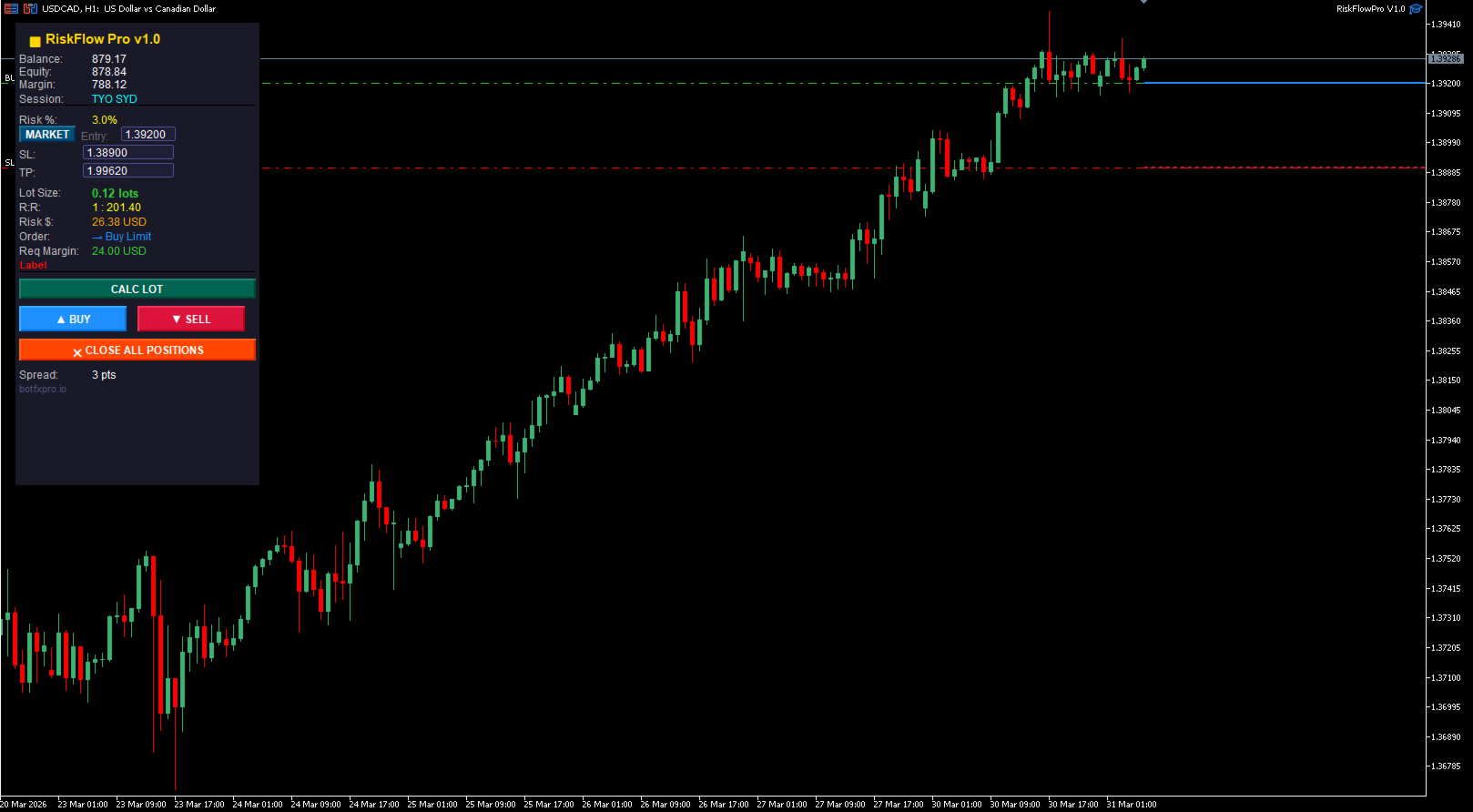 RiskFlow Pro is a professional manual trading dashboard for MetaTrader 5 , designed to eliminate the three biggest time sinks in manual trading: calculating lot sizes correctly, managing trades after entry, and staying within prop-firm risk rules. Drag, click, trade — every decision takes seconds, not minutes. Free for the first 500 downloads only. Grab yours before it is gone. WHAT IT SOLVES Most manual traders lose money not from bad setups, but from small operational mistakes