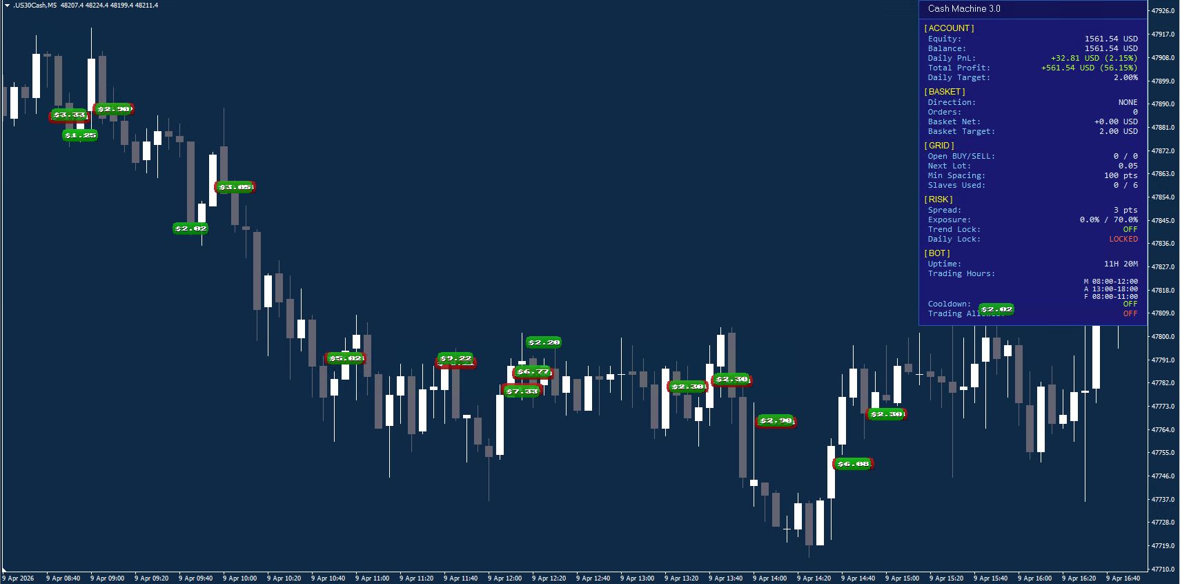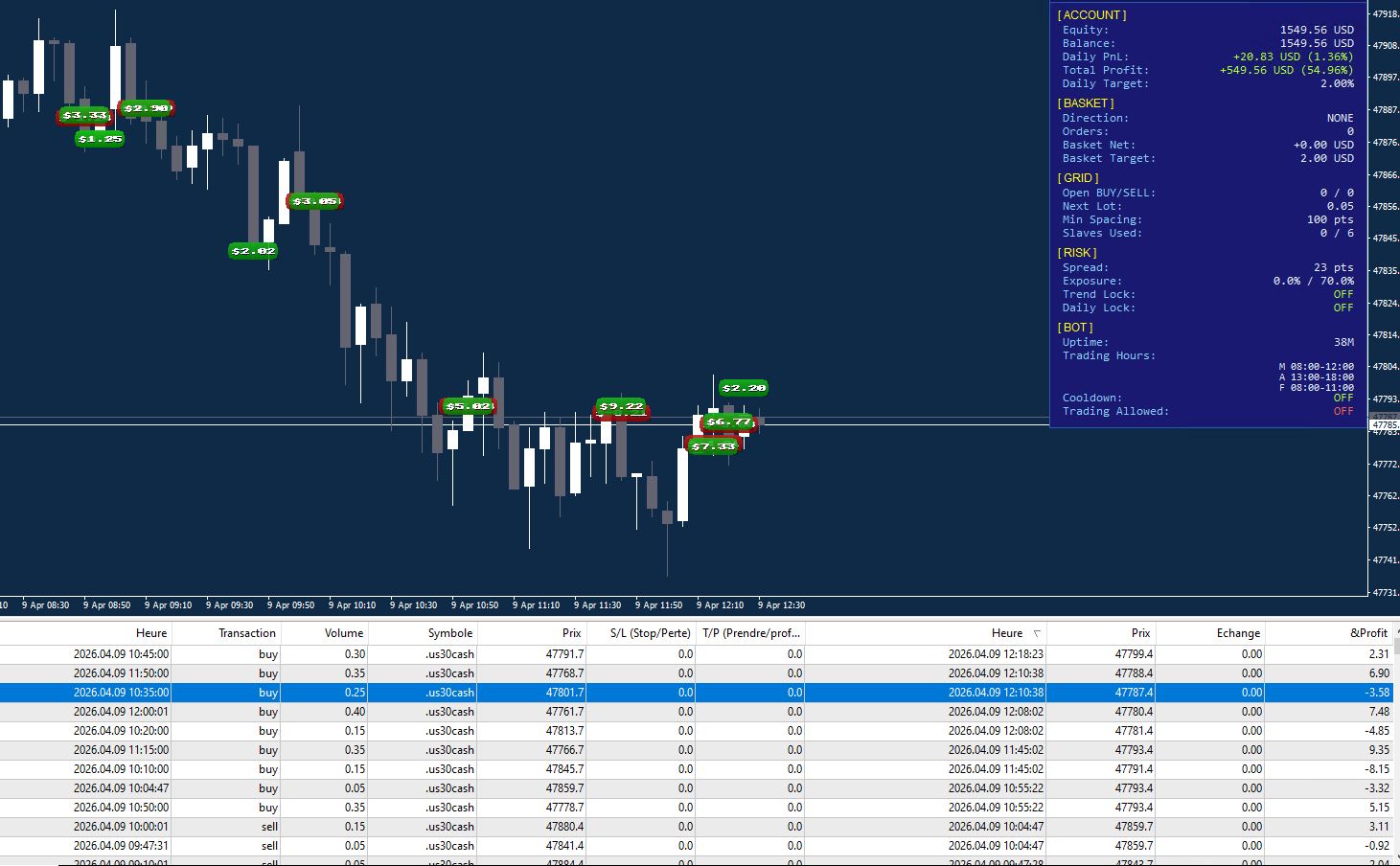 US30 Destroyer (MT4) - Secure grid and drawdown reduction on US30 Overview US30 Destroyer is an MT4 Expert Advisor designed for the US30 index, built around a structured grid logic with multiple safety layers to keep exposure under control. The robot is designed to work inside a clear framework: initial entry, position progression, basket management, and controlled exits. The goal is not to stack orders blindly. The goal is to manage the order sequence , better handle adverse moves, and reduce