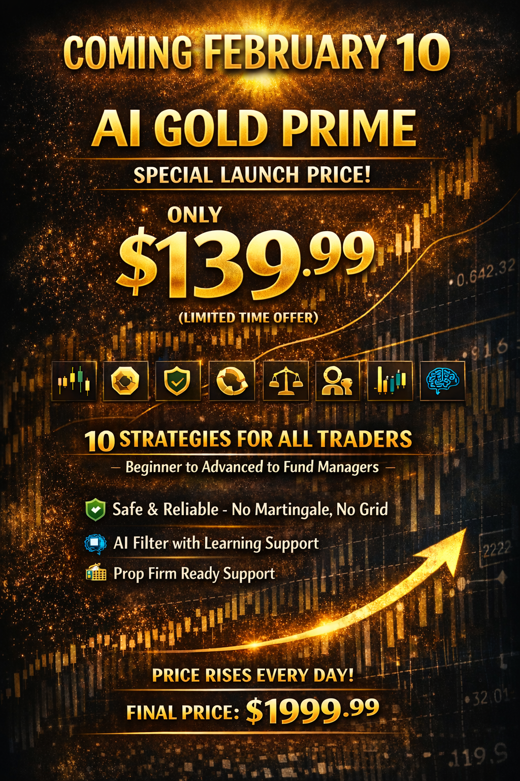 PROP FIRM READY: AI GOLD PRIME is Prop Firm ready with all configurations fully integrated; no external set files are required—simply select a preset or strategy and choose an appropriate risk level. PROMO: The current promotional price of AI GOLD PRIME is USD $139.99. The price is subject to scheduled increases every 24 hours until the final listed price of USD $4,999.99 is reached. Pricing may change without prior notice. AI GOLD PRIME runs smoothly and reliably alongside the two top