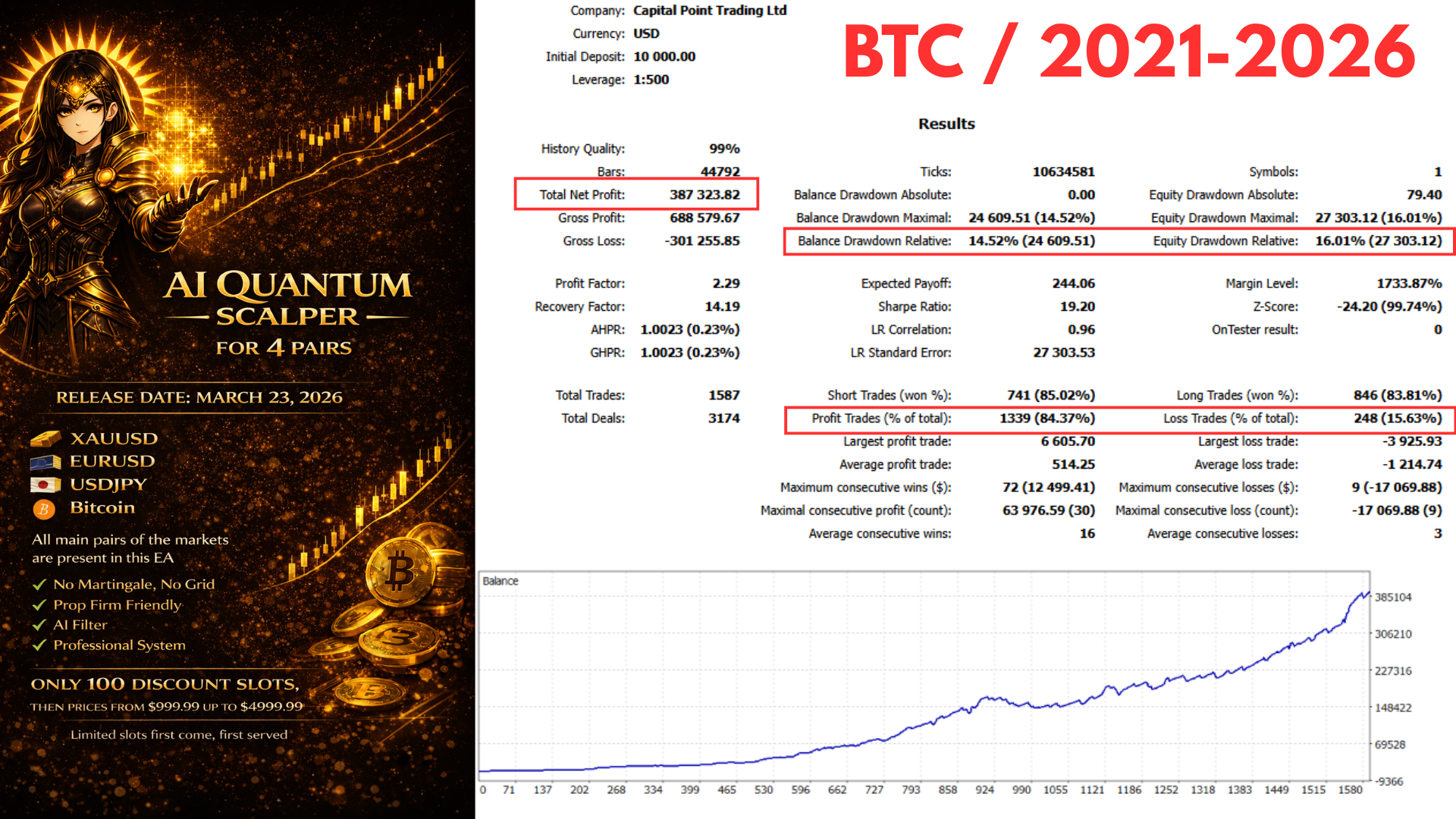 🚀 AI Quantum Scalper is an advanced automated trading system built for high-precision scalping across the world’s most liquid markets: XAUUSD, EURUSD, USDJPY, and Bitcoin.