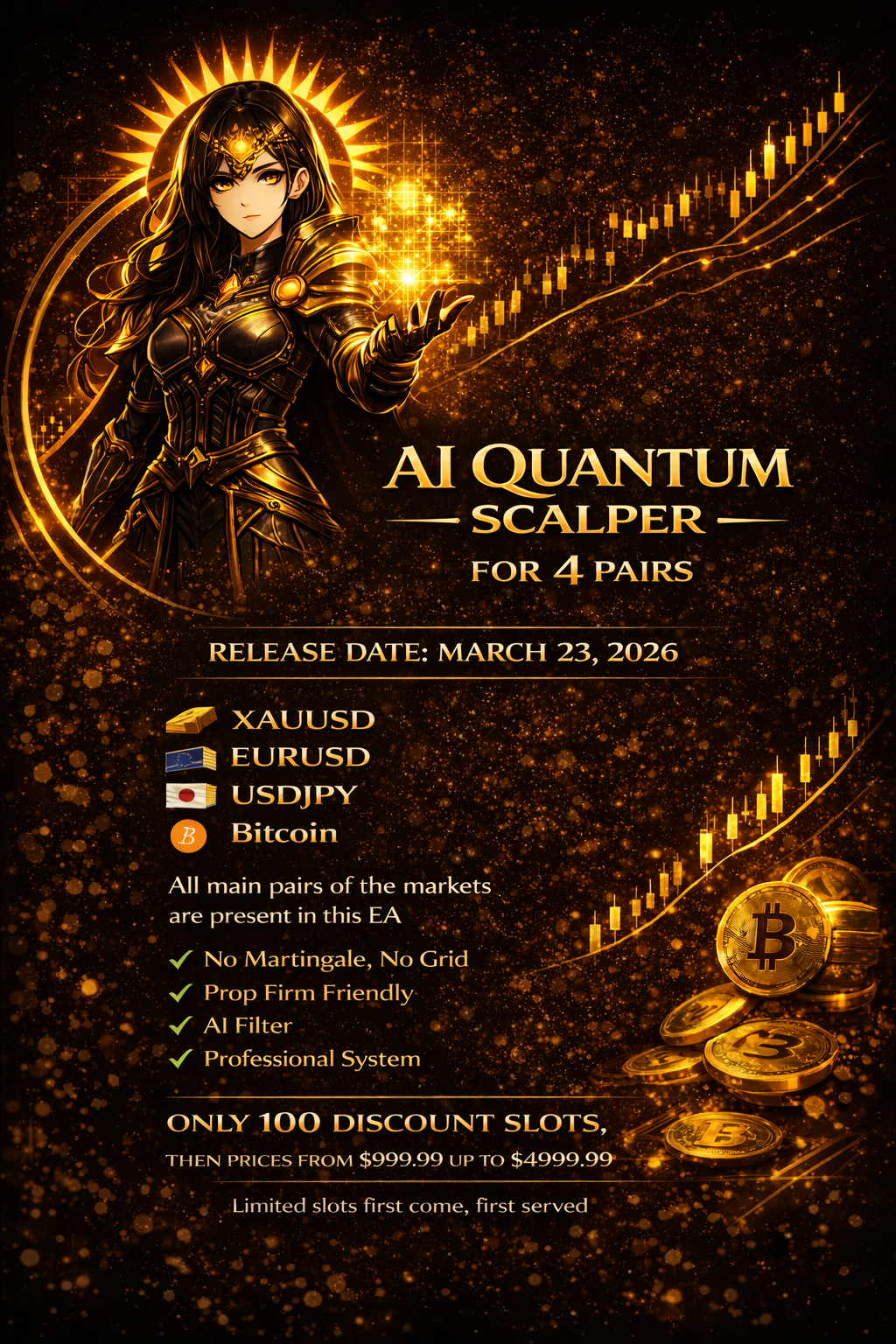 AI Quantum Scalper — The Evolution of Intelligent Execution Precision. Intelligence. Multi-Asset Mastery. DOWNLOAD SETFILE | INPUT GUIDE | SETUP GUIDE Only 33 copiers remaining. Lock in the lowest price before it's gone. Promotion: Discounted Price: The price increases by $50/$100 per day during the promotion period. Milestone Pricing: After the first 100 customers , the price will increase to $999.99 and will gradually rise up to $4999.99 over time. Special Offer: Purchase AI