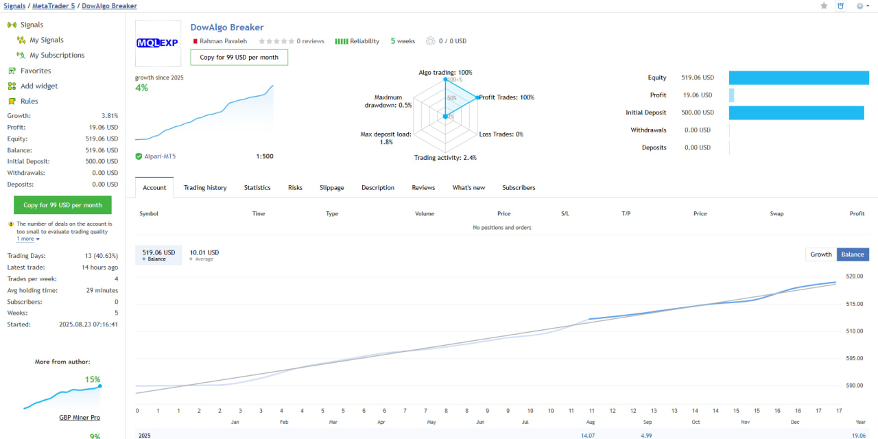 DowAlgo Breaker EA works on Time and Price theory. As the price patterns change, there will be no difference in performance of the EA, which is why this system has long-term stability and performance. The EA finds important and valuable price and executes trades based on them. This system works 100% automatically. Suitable for US30 index. MT4 : https://www.mql5.com/en/market/product/145607 "DowAlgo Breaker" [$ 175 > Next price > $ 199] Signal Mql5 :