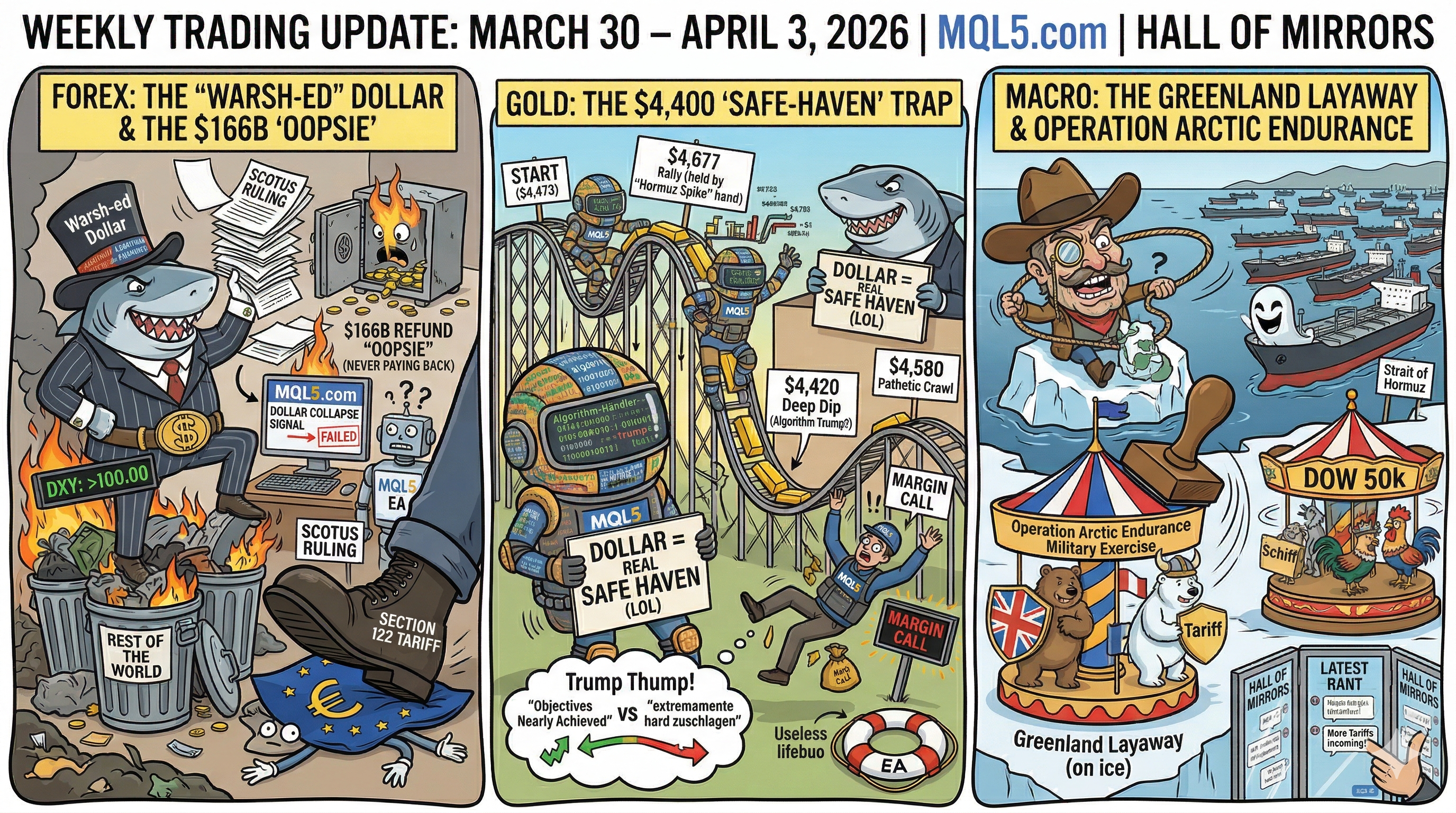 The currency markets spent the week behaving like a group of traders who accidentally drank decaf—mostly confused and slightly irritable. We opened Monday with a "Sell America" hangover as the Dollar Index (DXY) dipped below 98.00. The catalyst? A Supreme Court ruling that effectively called the President's previous global tariffs "illegal." For a brief moment, EUR/USD sniffed the 1.1550 level like an optimistic puppy, only to be kicked back into the 1.1400 basement by Friday. Why? Because the "Tariff King" took to Truth Social to explain that he has the "absolute right" to tax the world in "another form" and has already started doing so. By the time the Fed's March 18 meeting rolled around, the "Warsh-ed" Dollar was back in vogue, fueled by a hawkish dot plot that basically told the market: "Rate cuts are like Greenland—talked about often, but you're not getting them." On MQL5, the signal providers who went long on a "Post-SCOTUS Dollar Crash" are currently re-branding their accounts as "long-term humanitarian aid projects."