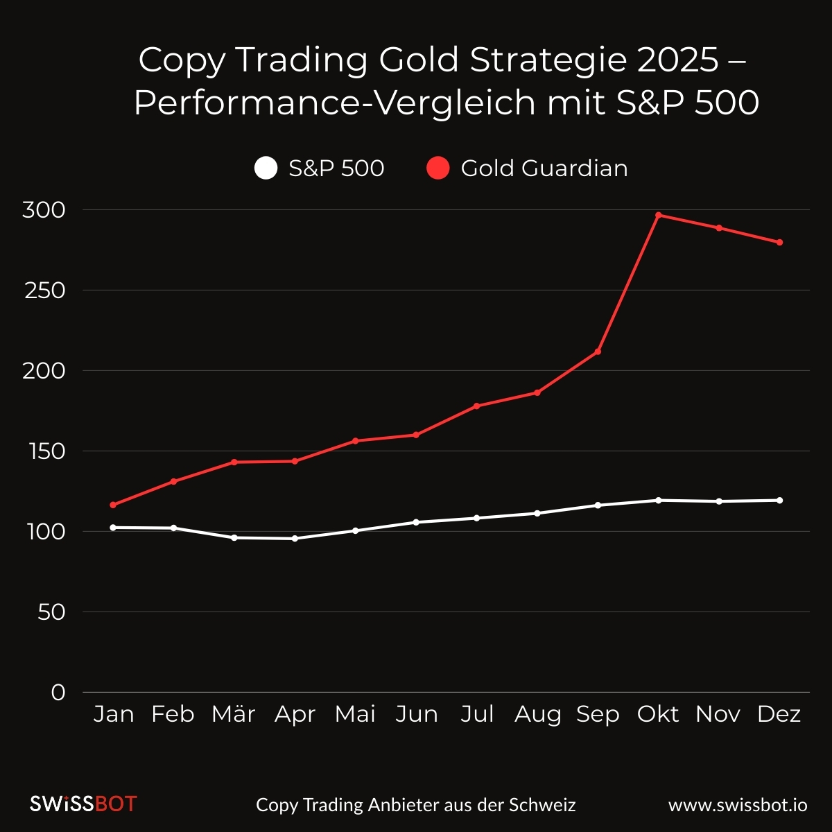 The year 2025 is over and it's time to take an honest look at the performance of our Gold (XAUUSD) copy trading strategy. With an annual performance of +179.7%, the strategy significantly outperformed the S&P 500 Index, which gained ‘only’ +19.2%. In concrete terms, this means that the minimum investment of CHF 2,500 at the end of the year turned into CHF 6,992 – a profit of CHF 4,492.
