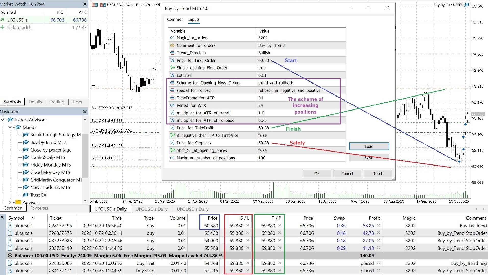Sometimes the markets are in such a trending phase that it is impossible not to notice and it is enough to simply buy with the trend. 1) So, we scroll through the charts of different instruments, and see a good entry point, so let's specify the desired price for the first order in the Price_for_First_Order parameter and the direction in the Trend_Direction parameter, this is already enough for a good deal. (If Price_for_First_Order=0, the position will open immediately at the market price.) 2)