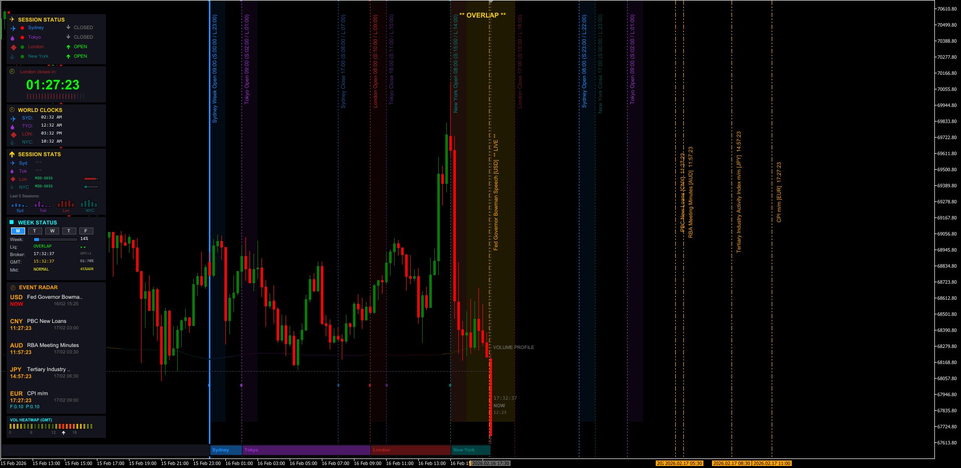 Forex Session Intelligence Dashboard ForexSessions is a comprehensive session awareness indicator that displays real-time trading session boundaries, economic events, and market context directly on your chart. It is designed for traders who use session-based strategies and need clear visual separation of the Sydney, Tokyo, London, and New York trading windows. The indicator automatically adjusts all session times for Daylight Saving Time changes across four regions (Australia, Japan, UK, US)