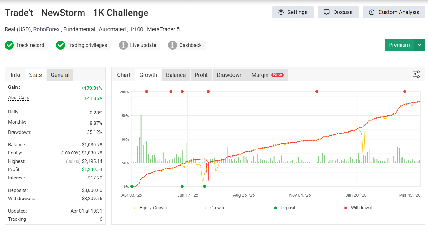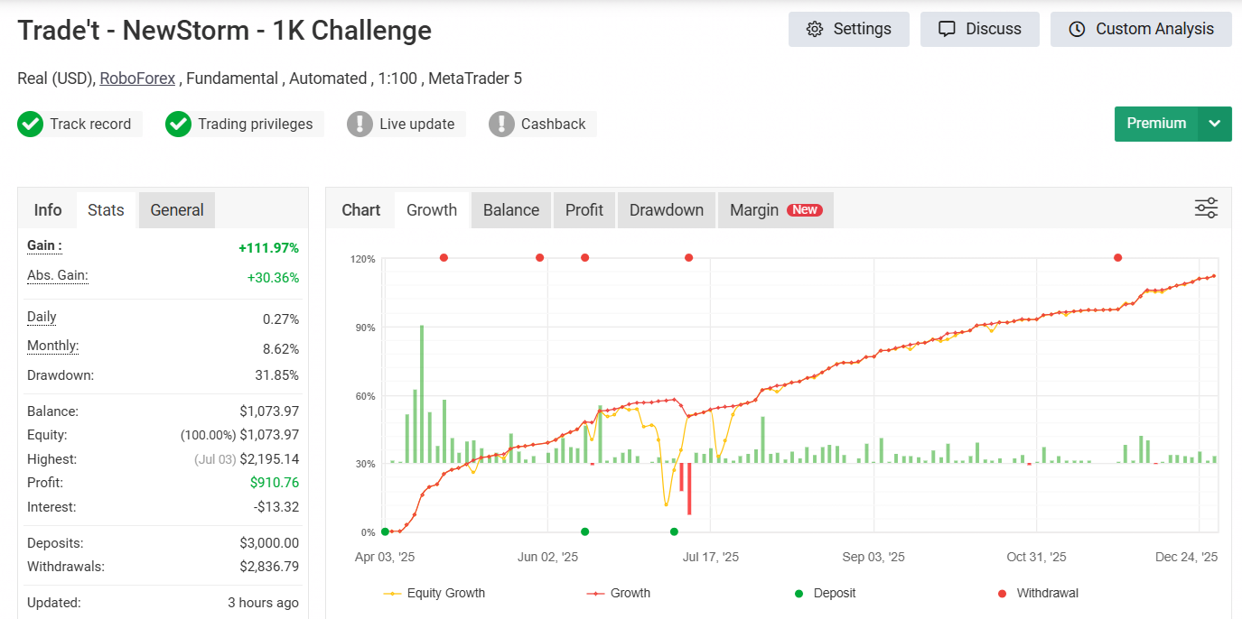 NewStorm EA has delivered over +100% growth in under one year, trading EURUSD and Gold, using a controlled grid system with a smart drawdown-reduction algorithm, designed to operate during major news conditions.