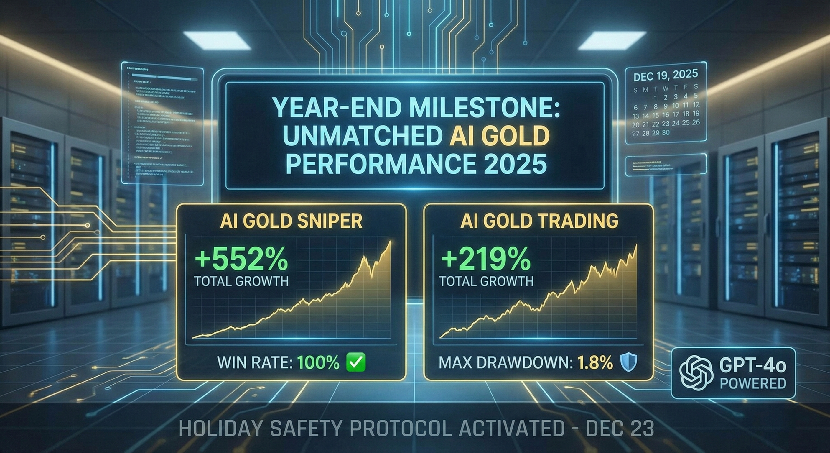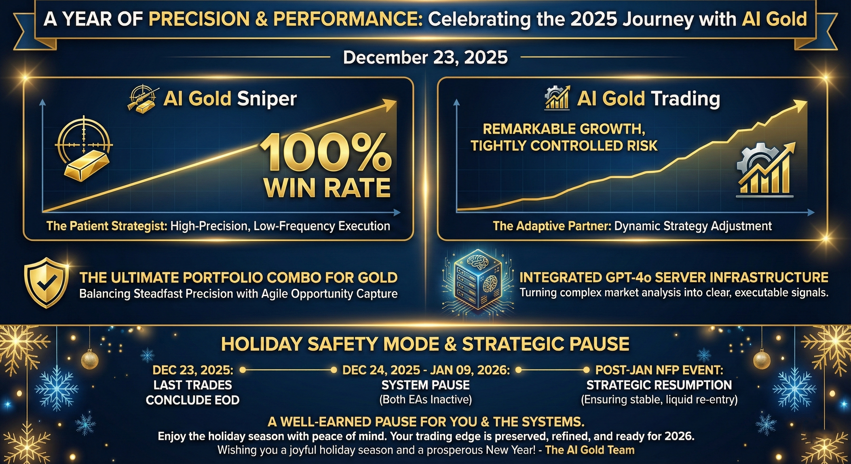 As the final trades close on December 23, 2025, we pause to celebrate an exceptional year of strategic automation. Our AI Gold Sniper and AI Gold Trading systems have not just navigated the markets; they have defined a new standard for consistency and intelligent execution in XAUUSD trading.