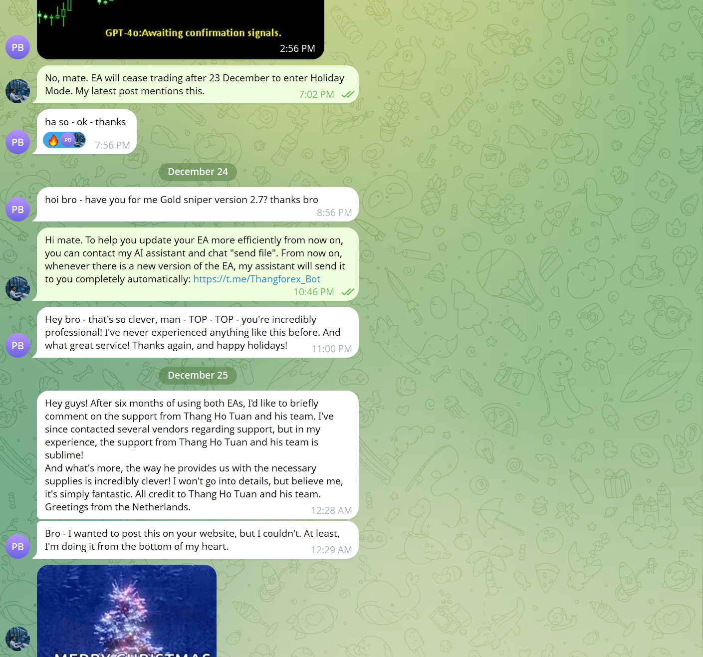 ✨ In this profession, the pressure can be immense. But it's these genuine messages, arriving on a holiday, that confirm I'm on the right path: delivering real value and sincere dedication. I sincerely hope to receive lots of feedback from everyone. This is an invaluable gift that motivates me to develop and optimize EA better every day.