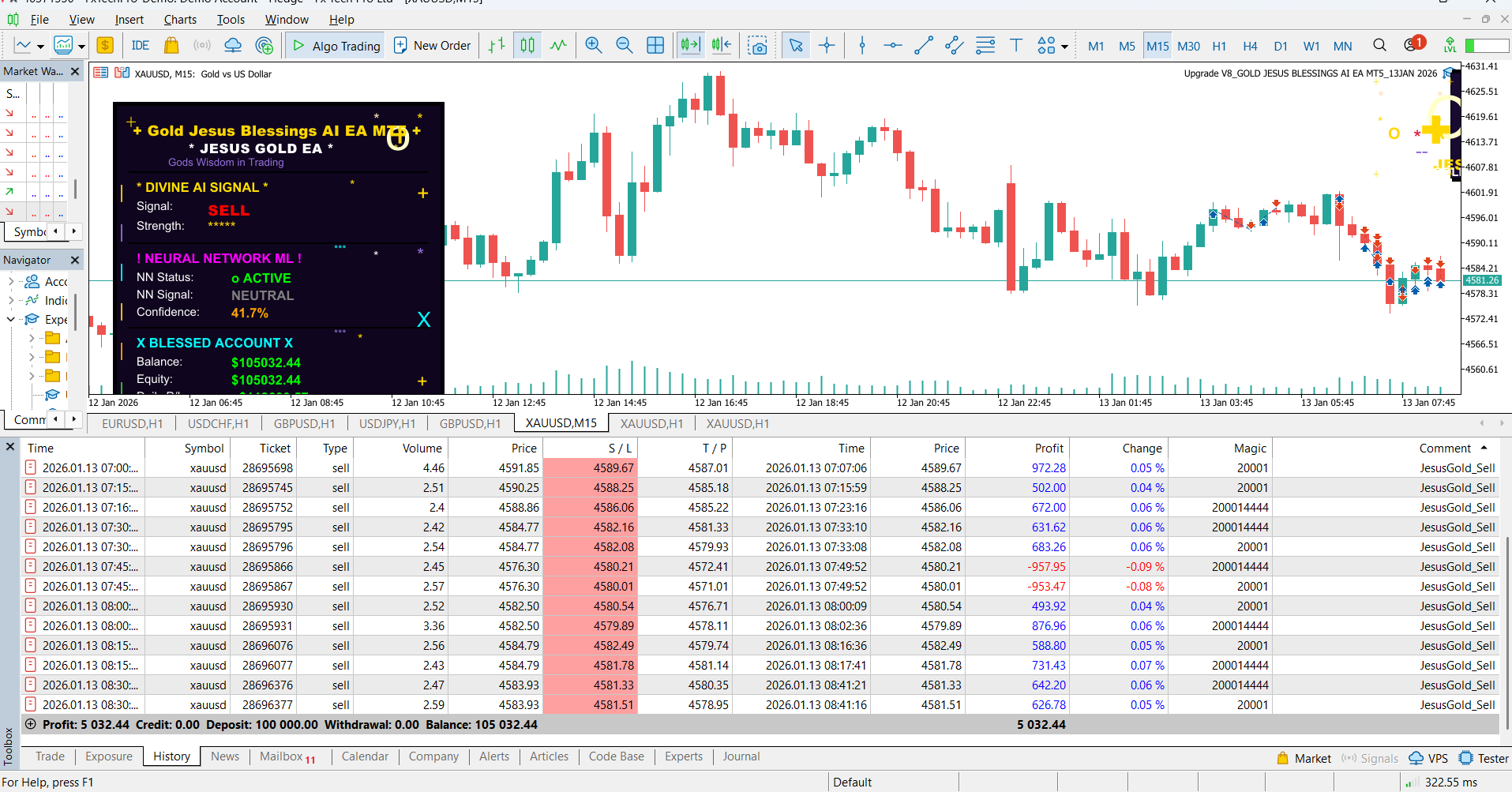 🔷 Gold Jesus Blessings AI Neural EA MT5 for XAUUSD Auto Trading - New York Session Recommended - Use Latest Upgrade V8 as of 13 Jan 2026 Use Every tick Mode & 1 Mint OHLC mode for Back-test. (Note the EA is by default set for 3 Digit Broker, for 2 Digits broker, write to me for set file-I'll share) Launch Offer for 1st 10 Copies Only at $198 - Price will be hiked to $299 after sale of 1st 10 copies. Advanced AI-Driven XAUUSD Trading Expert Advisor Gold Jesus Blessings AI Neural EA MT5