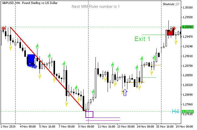 Salida: según la regla 2 (aparición de una nueva señal en la dirección opuesta después de cruzar el extremo del "setup")