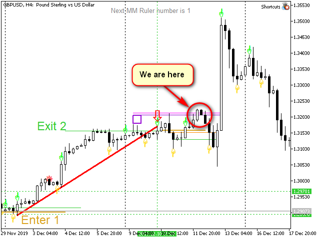 Entonces, a las 8 am del 12 de diciembre (línea vertical verde después de la activación del stop), colocamos una orden límite en 1.307, un stop en 1.297 y un take-profit en 1.338 (por lo general, somos conservadores), y luego escribimos algo útil 😉 Después de activarse las órdenes, el beneficio es de unos 310 puntos.