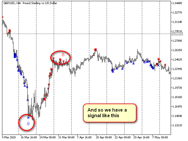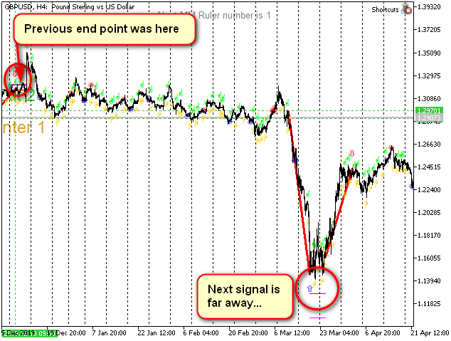 Seguimos viendo que a veces las flechas marcan la parte superior de los grandes movimientos para una escala dada con una precisión asombrosa, pero no merece la pena seguir "ciegamente" sus señales, ya que el indicador se adelanta mucho. :-) En ocasiones, dan ganas incluso de entrar en un viraje... Que las flechas que están hacia abajo indiquen hacia arriba, ¡y viceversa! Técnicamente fácil... Pero quizá sea mejor abstenerse... Solo tendremos en cuenta que es más barato asumir que inmediatamente después de una señal de flecha, es probable que la tendencia prosiga en lugar de virar. Al menos una vela más.