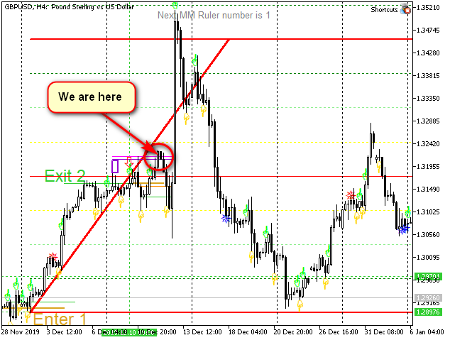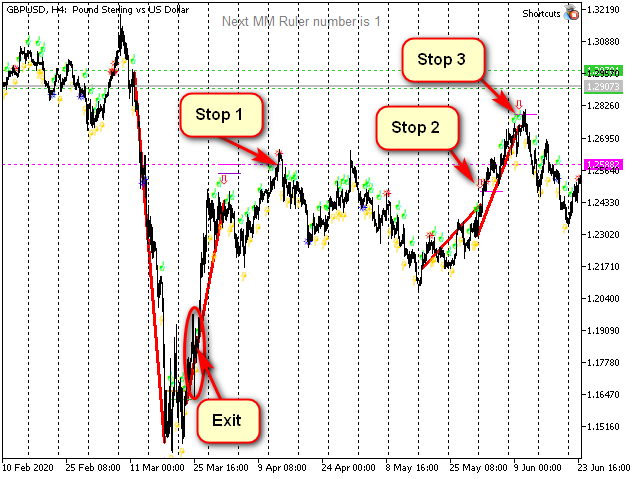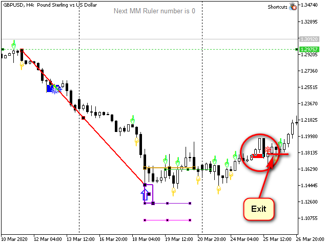 - si el final del "setup" de señales se rompe y se forma una nueva flecha (signo de viraje de tendencia). En la figura se indica como Exit 2.