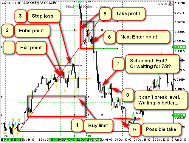 - si se completa un nuevo "setup" (de 9 barras) en la dirección opuesta, pero el final del "setup" de la señal no se interrumpe (Exit 1 en la imagen);